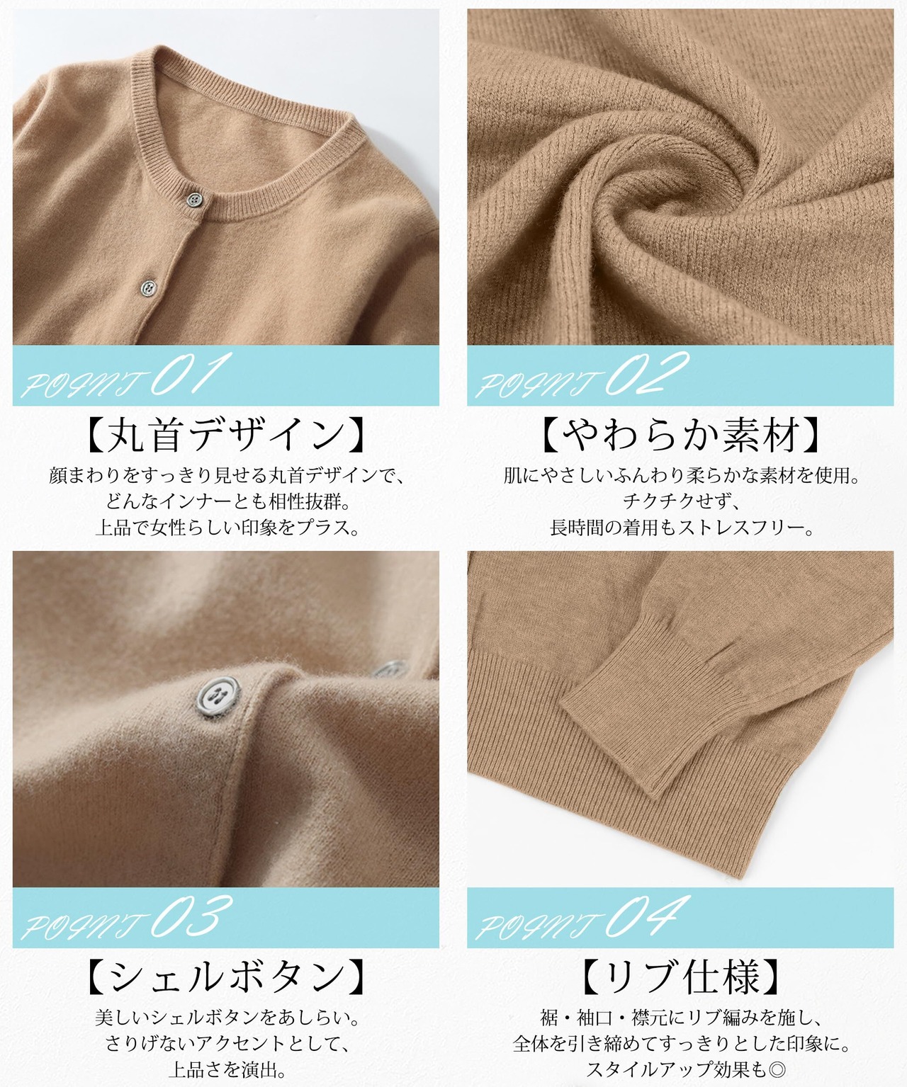 【やわらか素材・着心地よいカーディガン】肌にやさしい柔らか素材を採用し、チクチクせず快適な着心地を実現。薄すぎず厚すぎない絶妙な生地感で、どの季節にも対応可能です。軽やかな着心地とサッと羽織れるのが魅力で、デイリー使いにもぴったりニットカーデ!
