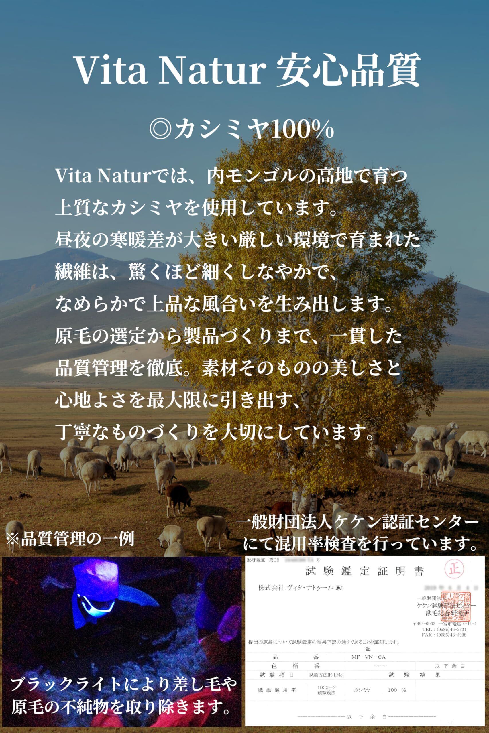 【ふんわり柔らか心地よい肌触り】Vita Naturでは、特に高い品質のカシミヤを使用しております。その糸はイタリアの有名メーカーやトップブランドでも使用されています。冬は零下30度以下、夏は30度を超す厳しい気候条件の中で生活するカシミヤ山羊から、手間と時間をかけてわずかだけ取れるカシミヤを贅沢に使用しています。