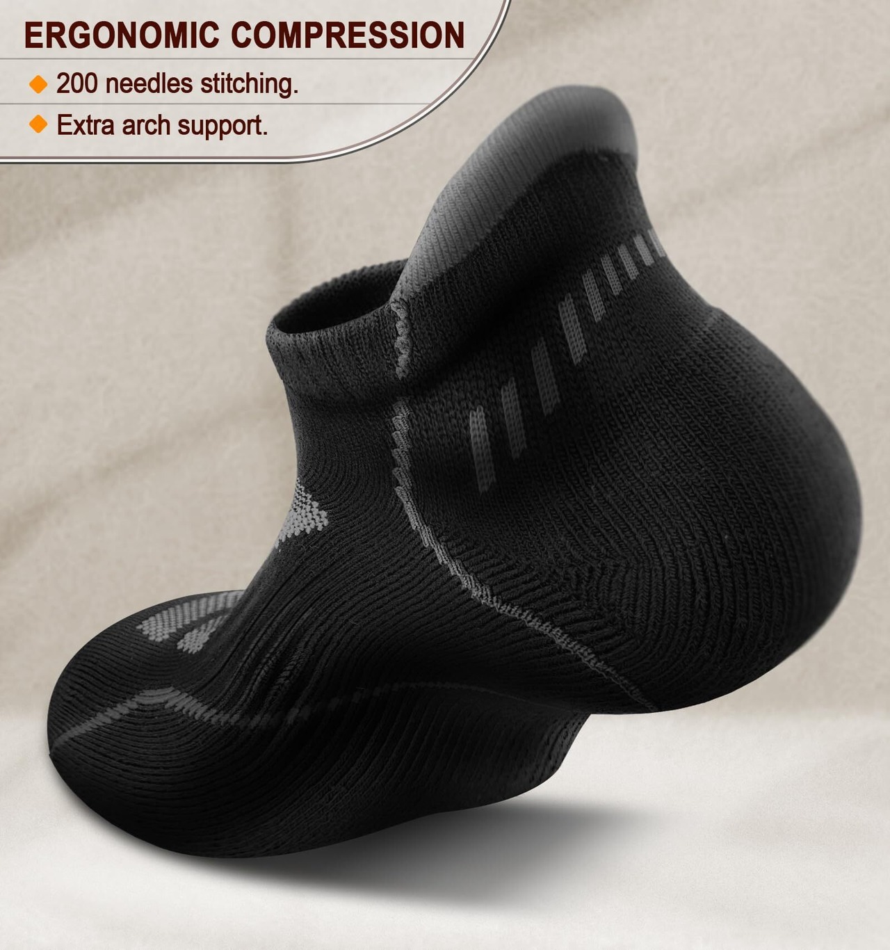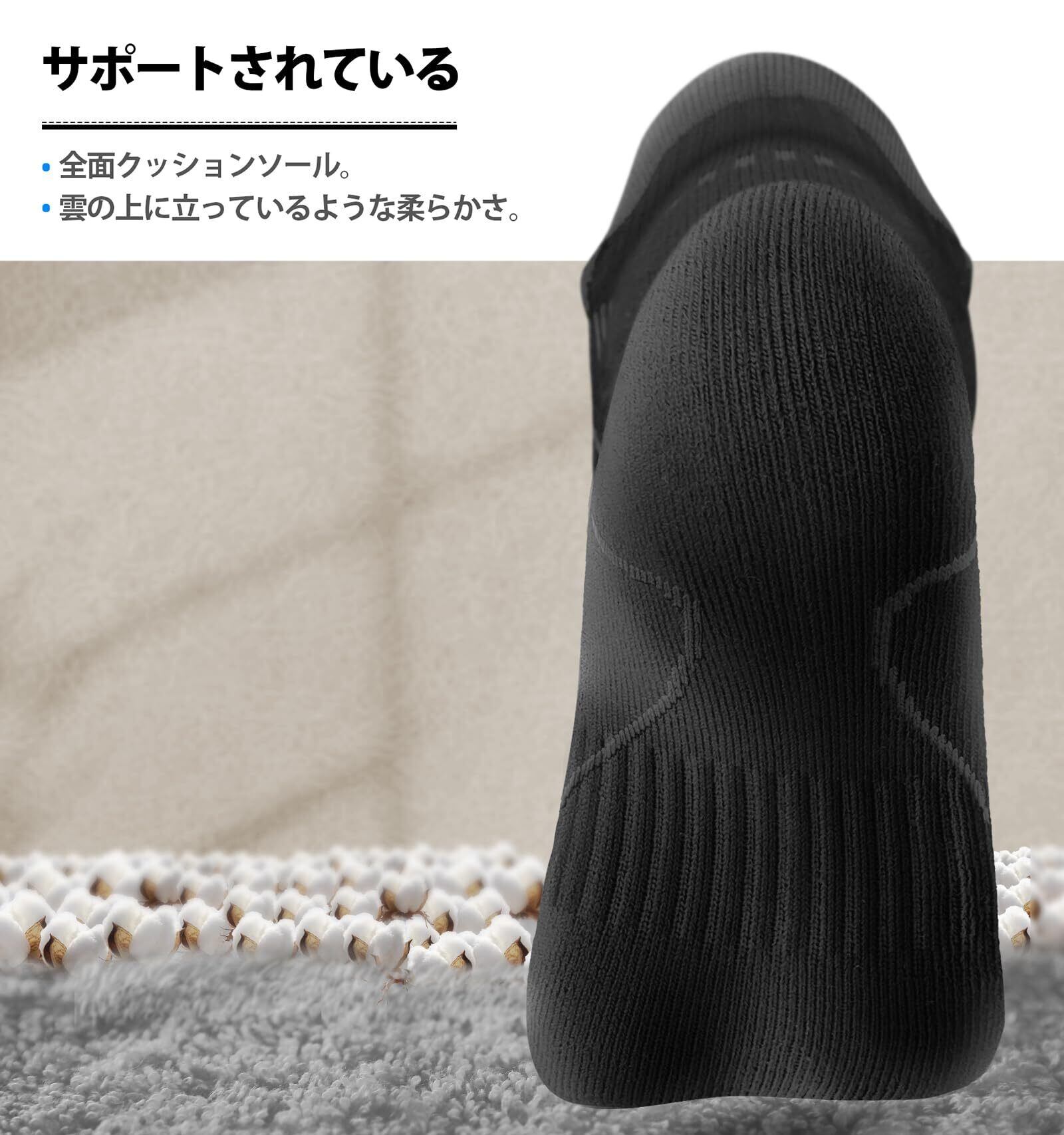 耐久性 - この靴下は、つま先の関節部分に気泡防止ステッチを施し、かかとやつま先などの衝撃の多い部分を補強しており、ナイロン素材を使用しているため、洗濯時の耐縮み性が向上しています。