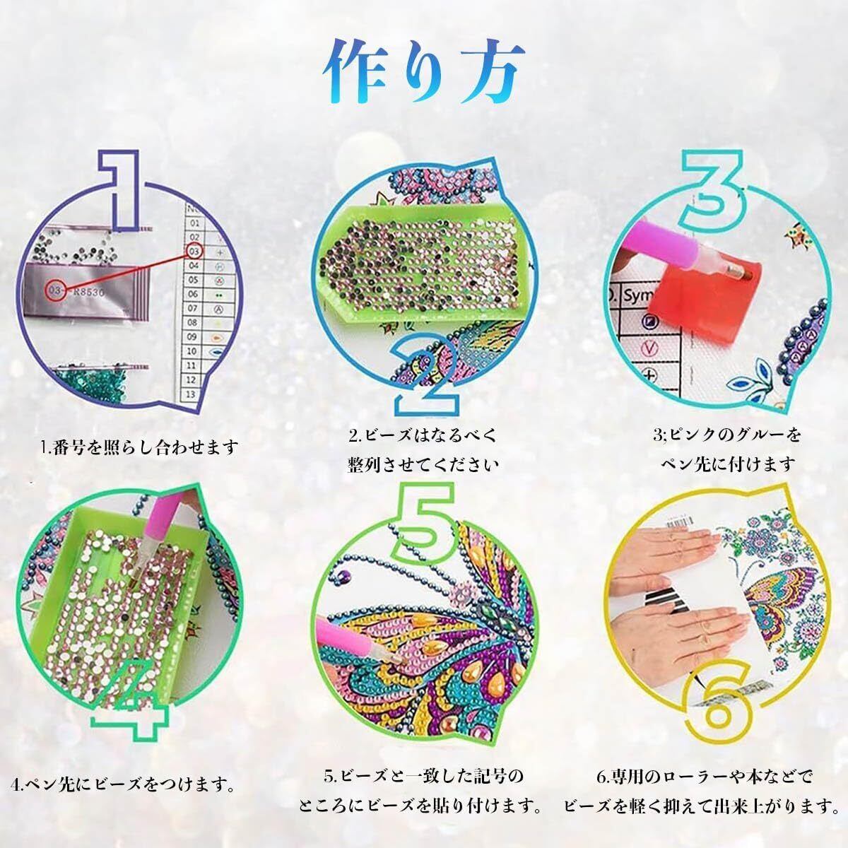 【作り方は簡単】ペン先をピンクのグルーを付けて台紙にビーズと同じ記号または英数字を貼り付けるだけでキラキラなダイヤモンドアートが仕上がります。クロスステッチ刺しゅうより気軽になり、集中力がUP、達成感もじゅうぶん味わっていただけます。