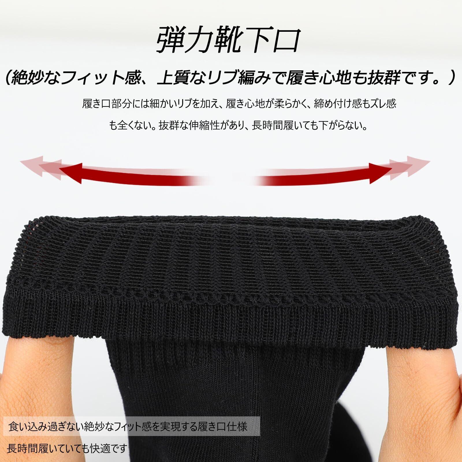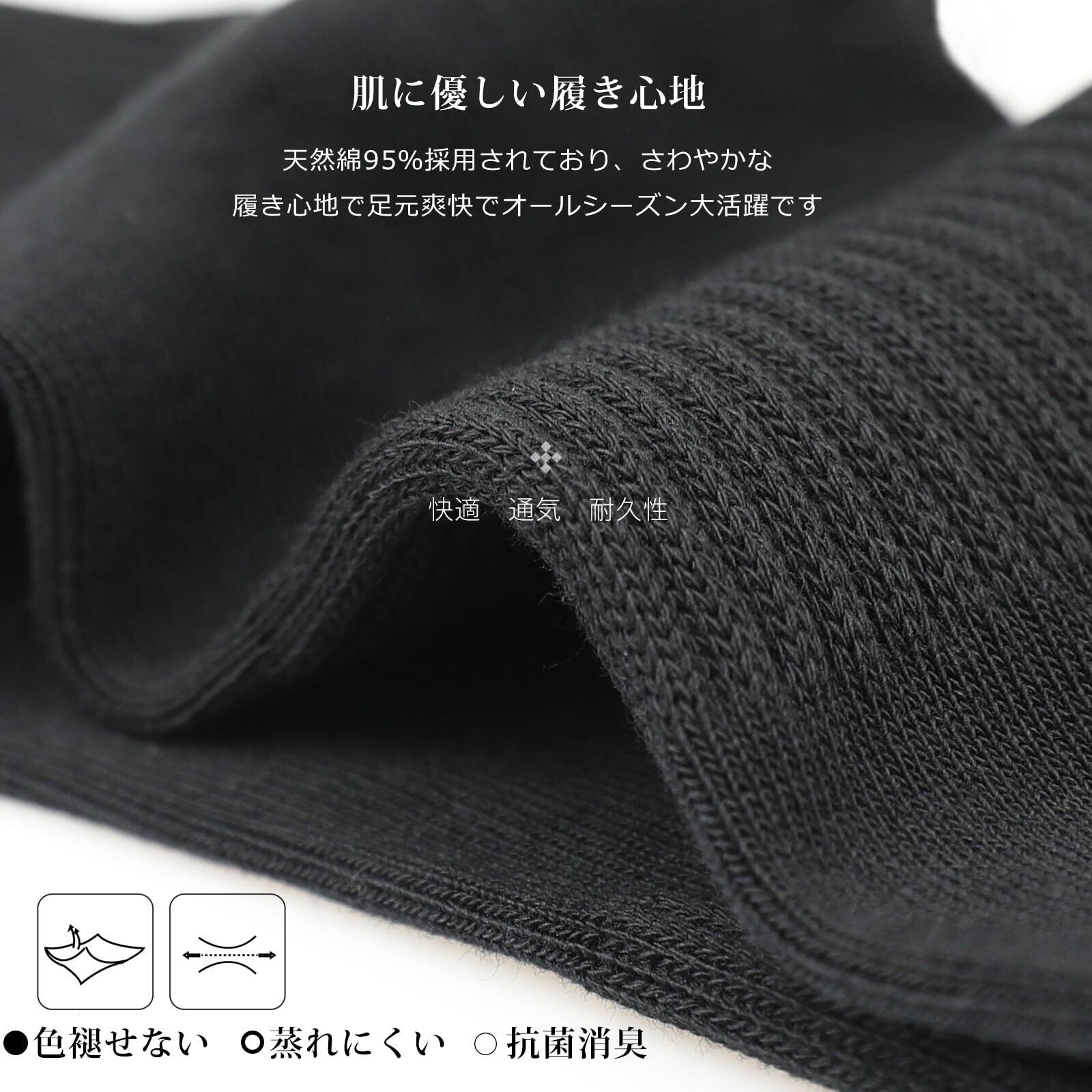 【高品質な靴下】95%天然綿、5%スパンデックスという組成で、肌触り、伸縮性、通気性等をバランスします。夏用しても蒸れない。足底サポート設計、抗菌消臭の加工、毛玉になりにくい繊維あり、縫い目なしなどの技術をされてるから、伸縮性が強く、色移りはなく、肌触り履き心地が良い上質の長持ち靴下。カジュアル、ビジネス、スポーツ用にぴったりです。伸縮性は大きく大きな足も変形した足にもフィットする。