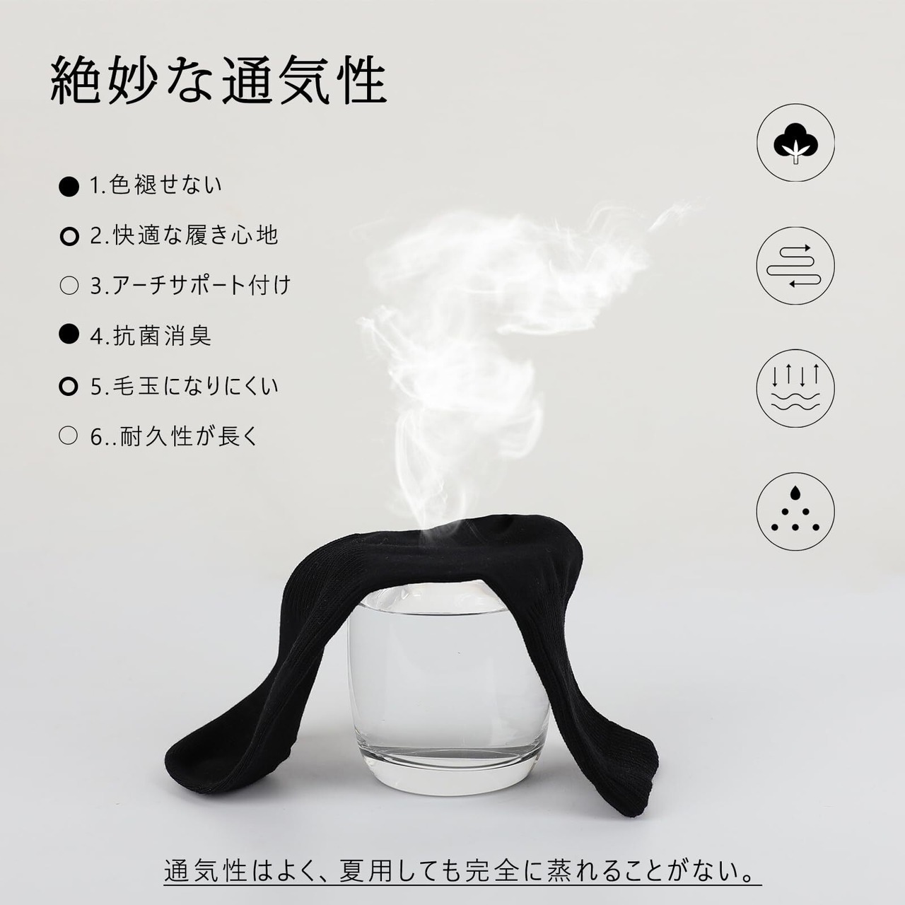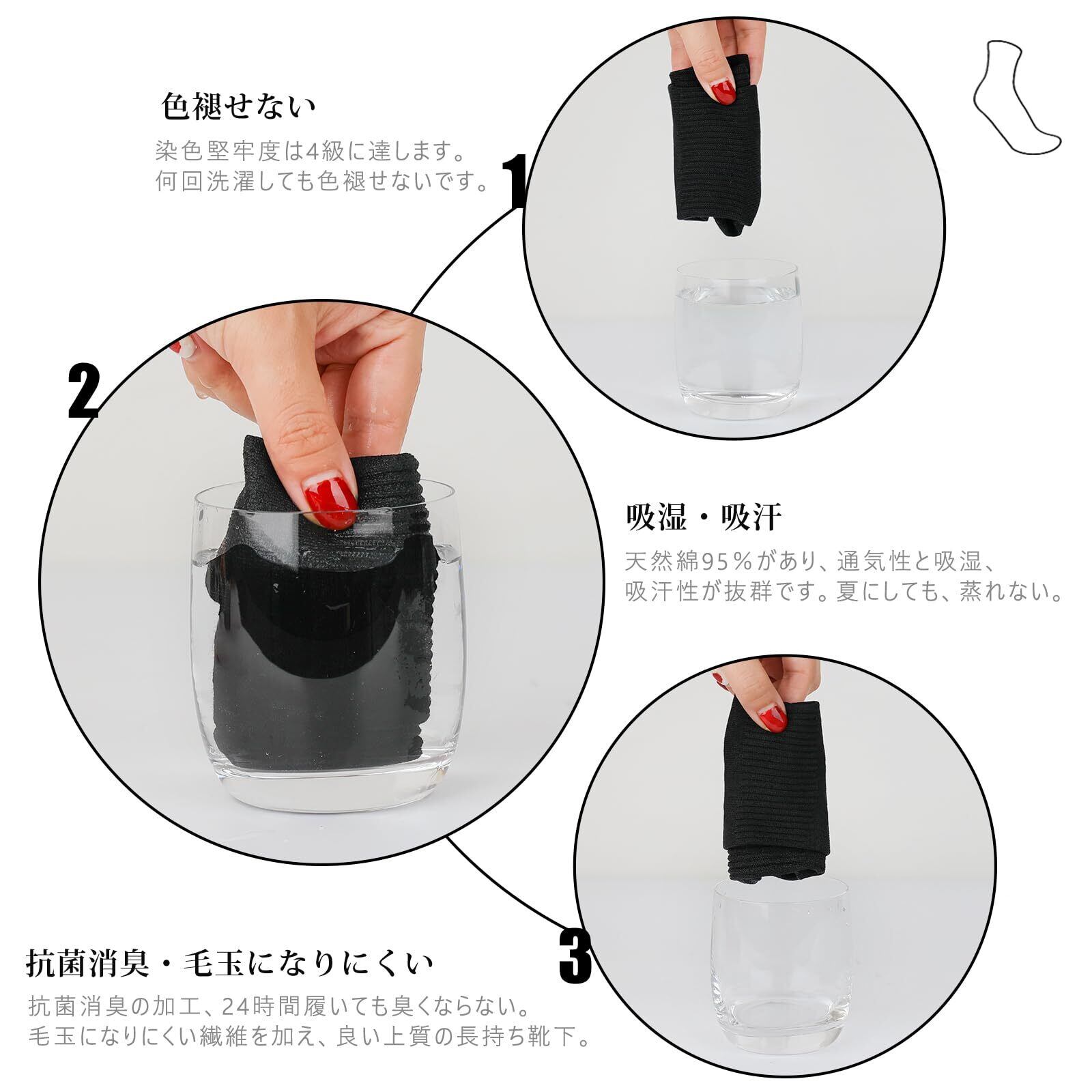 【抗菌消臭効果】通気性はよく、抗菌防臭の加工をされてるから、夏用しても蒸れない、24時間履いても臭くならない。革靴からは革の臭いしかしないくらい全く足の臭いはしない。気になる足の嫌なニオイや雑菌の繁殖を抑えられ、消臭効果が発揮できます。梅雨時期から夏にかけても快適にはけるソックスです。足首の締め付けがなくて、一日履いでもむくまなく、くたびれた感じがありません。靴の臭いが気になる人がいたら、是非抗菌、防臭の靴下を試してください。
