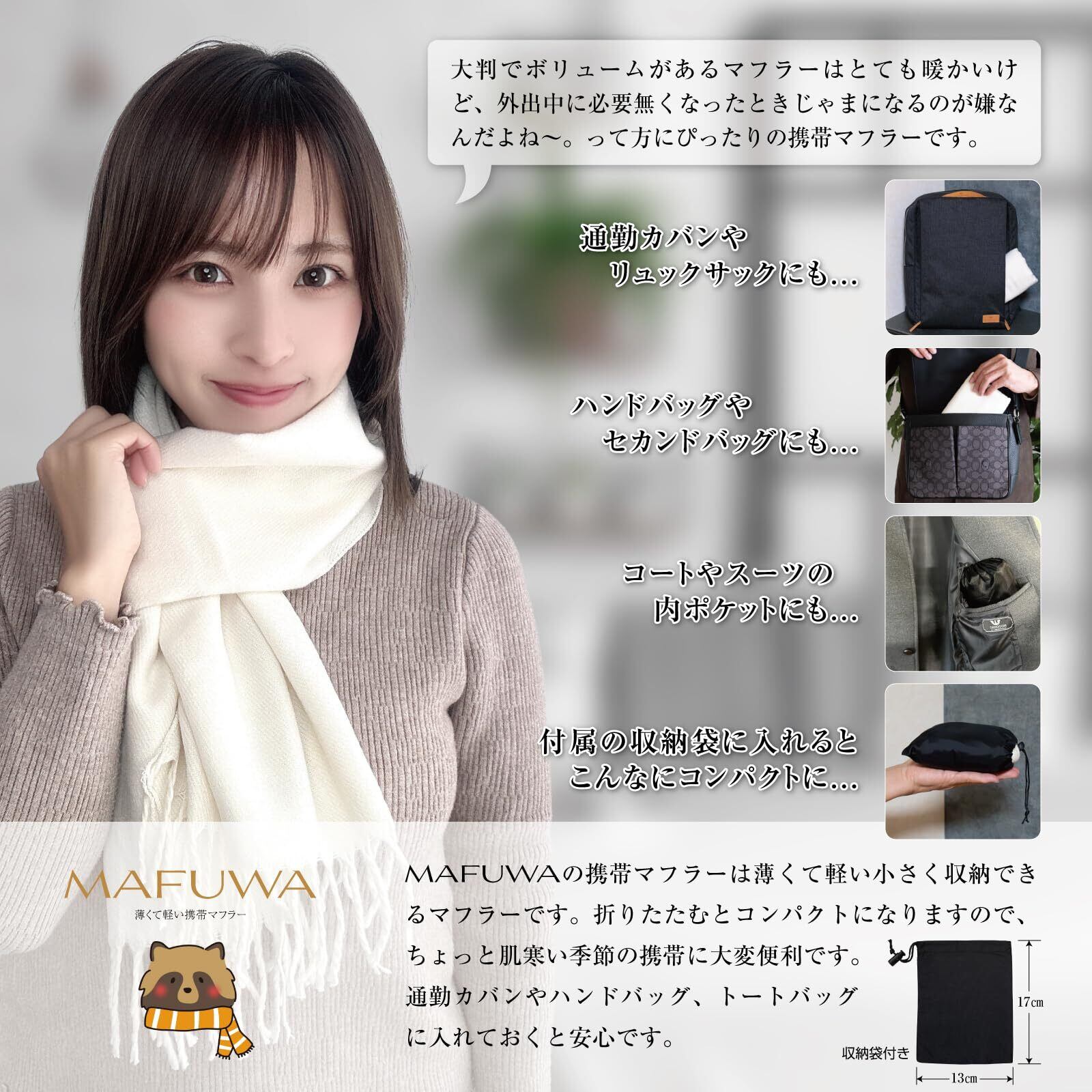 【収納バッグ付属】 MAFUWAの携帯マフラーは薄くて軽い小さく収納できるマフラーです。折りたたむとコンパクトになりますので、ちょっと肌寒い季節の携帯に大変便利です。通勤カバンやハンドバッグ、 トートバッグに入れておくと安心です。ふわふわでボリュームがあるマフラーはとても暖かいけど、外出中に必要無くなったときじゃまになるのが嫌なんだよね~。って方にぴったりの携帯マフラーです。