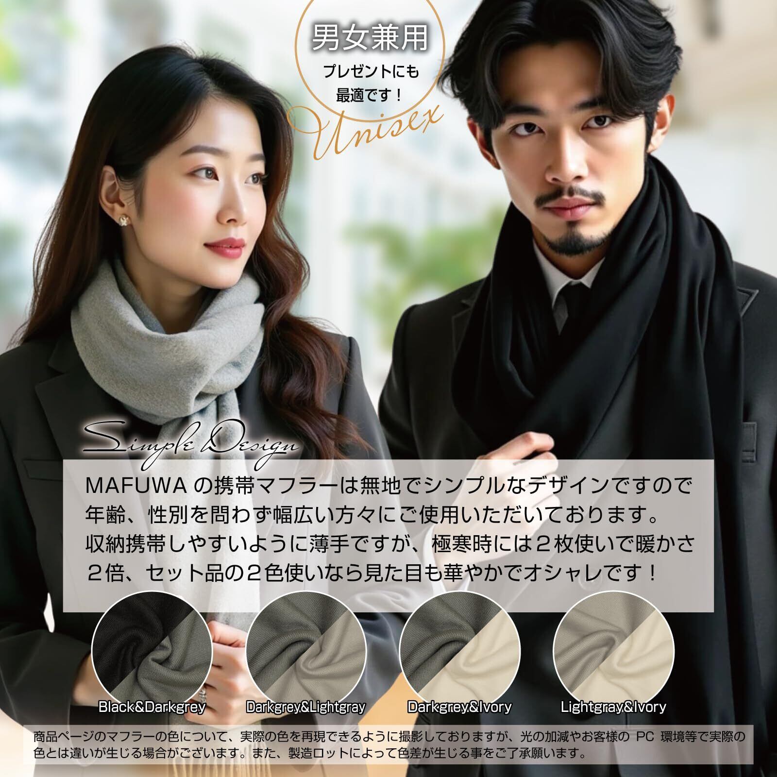 ●幅約35m×長さ約170cm(フリンジ含む)の中判サイズで重さはわずか約100gでとても軽いです。厚過ぎないほどよい生地感で巻き方やアレンジも自由自在です。●高品質のアクリル素材を使用し、生地の密度が高く薄手で軽いのに暖かくしっとりとした優しい肌触りに仕上がっています。●MAFUWAの携帯マフラーは薄くて軽い小さく収納できるマフラーです。折りたたむとコンパクトになりますので、ちょっと肌寒い季節の携帯に大変便利です。通勤カバンやハンドバッグ、トートバッグに入れておくと安心です。●MAFUWAの携帯マフラーは無地でシンプルなデザインですので年齢、性別を問わず幅広い方々にご使用いただけます。カラーはブラック、ダークグレー、ライトグレー、アイボリーと誰もが似合う飽きのこない定番の4色展開です。