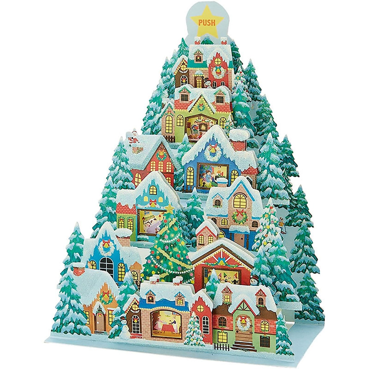 クリスマス&ウィンターソングが20曲入っています。ボタンを押すたびに曲が変わり、家々の中に光がともります。