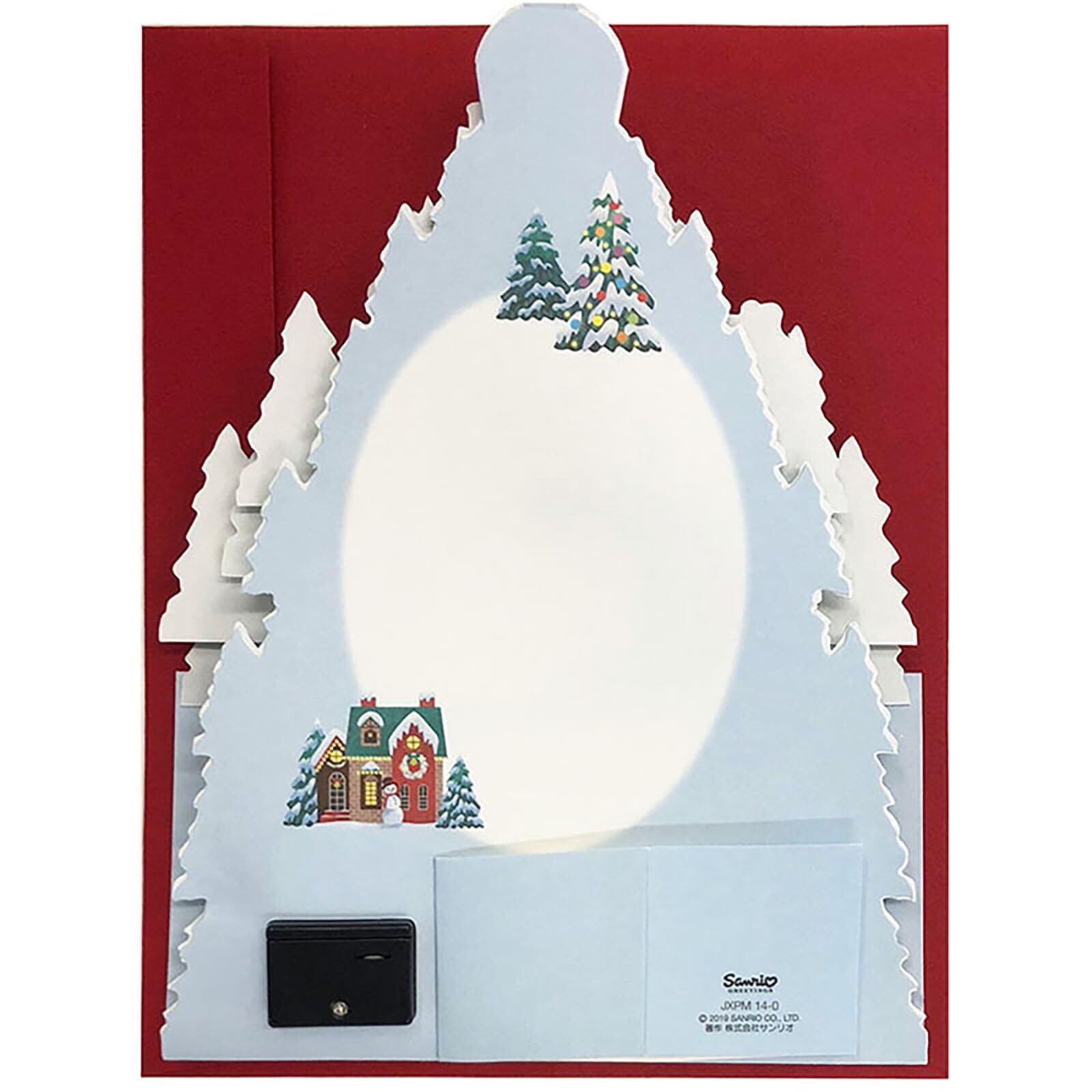 ・16.1x21x1cm ・立体ライト&メロディーカード ・カードの下部を手前に開くと斜面に建つ家や木が立体になり、ツリー形の風景として立てて飾れます。ツリートップのボタンを押すと、曲に合わせて光がともり、家々の中の温かなクリスマスの様子がお楽しみいただけます。キラキラ光るラメ加工を施しています。カードの裏側にメッセージスペースがあります。 ・電池交換できます。光った静止画はイメージです。音と光り方は動画をご覧ください(動画内のカードは試作サンプルのため、実際とは一部異なる場合があります。動画には撮影のための演出小物が含まれています。商品ではございませんので、あらかじめご了承ください。試聴されている音質は、実際の音質とは異なります) ・曲目:クリスマス&ウィンターソング20曲 ・郵便料金(国内)は140円です。 ・©2019 SANRIO CO., LTD.