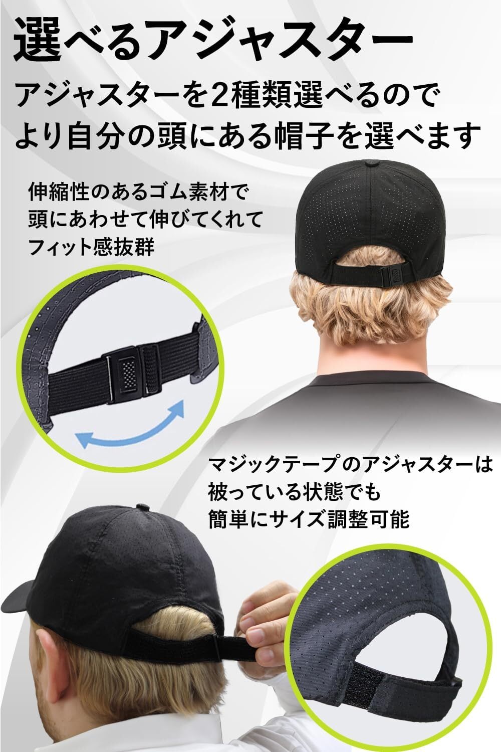 【アジャスター】伸縮性のあるアジャスターが頭の大きさに合わせて伸びてくれるのでピッタリフィット!動いている時の帽子のズレを軽減し、スポーツに集中できる。