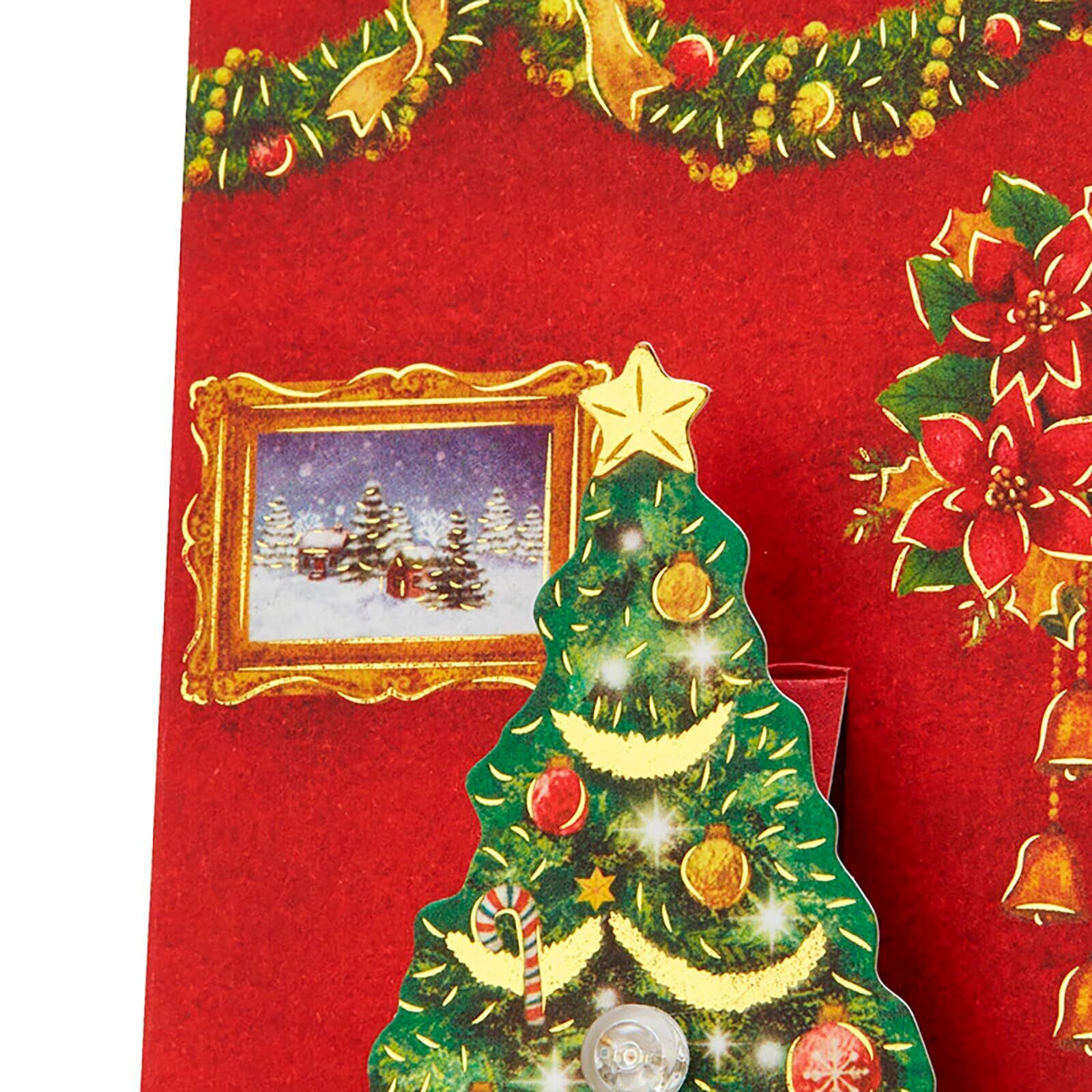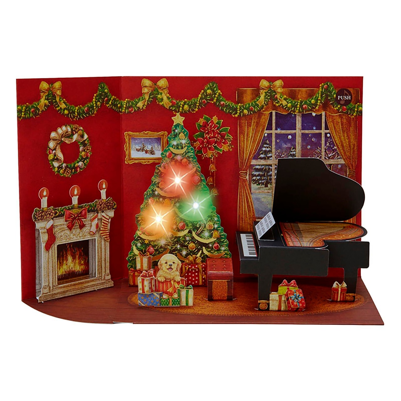 緻密に描き込まれたクリスマスツリーやグランドピアノなどが立ち上がる、ドールハウスのような立体カードです。