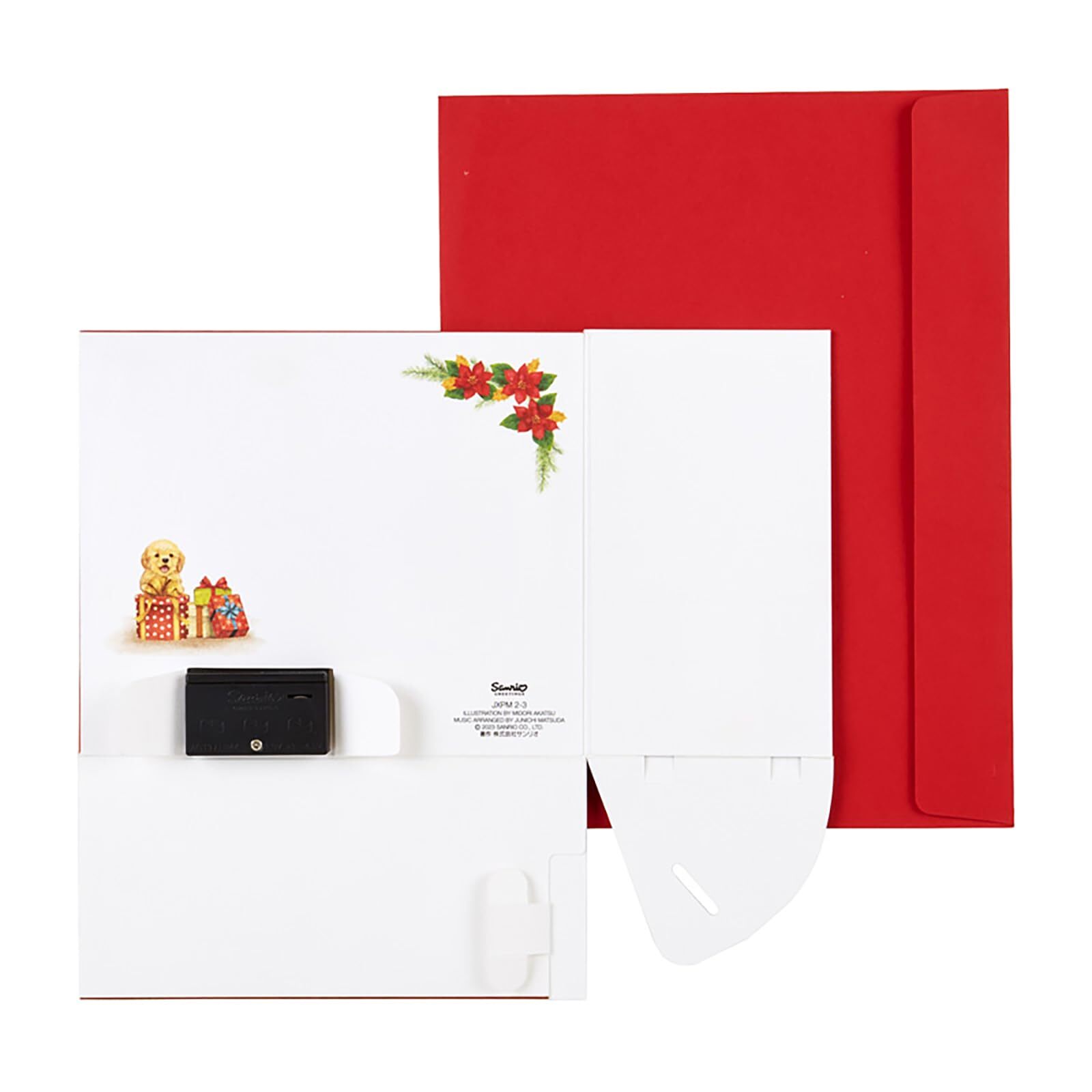 ・15.5x20x1cm ・立体ライト&メロディーカード ・クリスマスツリーやグランドピアノなどが立ち上がる、ドールハウスのような立体カードです。緻密に描き込まれた重厚感のあるデザインで、全体に華やかな金箔加工が施されています。ボタンを押すとピアノで奏でるクリスマスメロディーが流れます。立てて飾れます。カードの裏側にメッセージスペースがあります。 ・電池交換できます。光った静止画はイメージです。音と光り方は動画をご覧ください(動画内のカードは試作サンプルのため、実際とは一部異なる場合があります。動画には撮影のための演出小物が含まれています。商品ではございませんので、あらかじめご了承ください。) ・曲目:ピアノメロディー4曲入り ・郵便料金(国内)は140円です。 ・©2023 SANRIO CO., LTD.