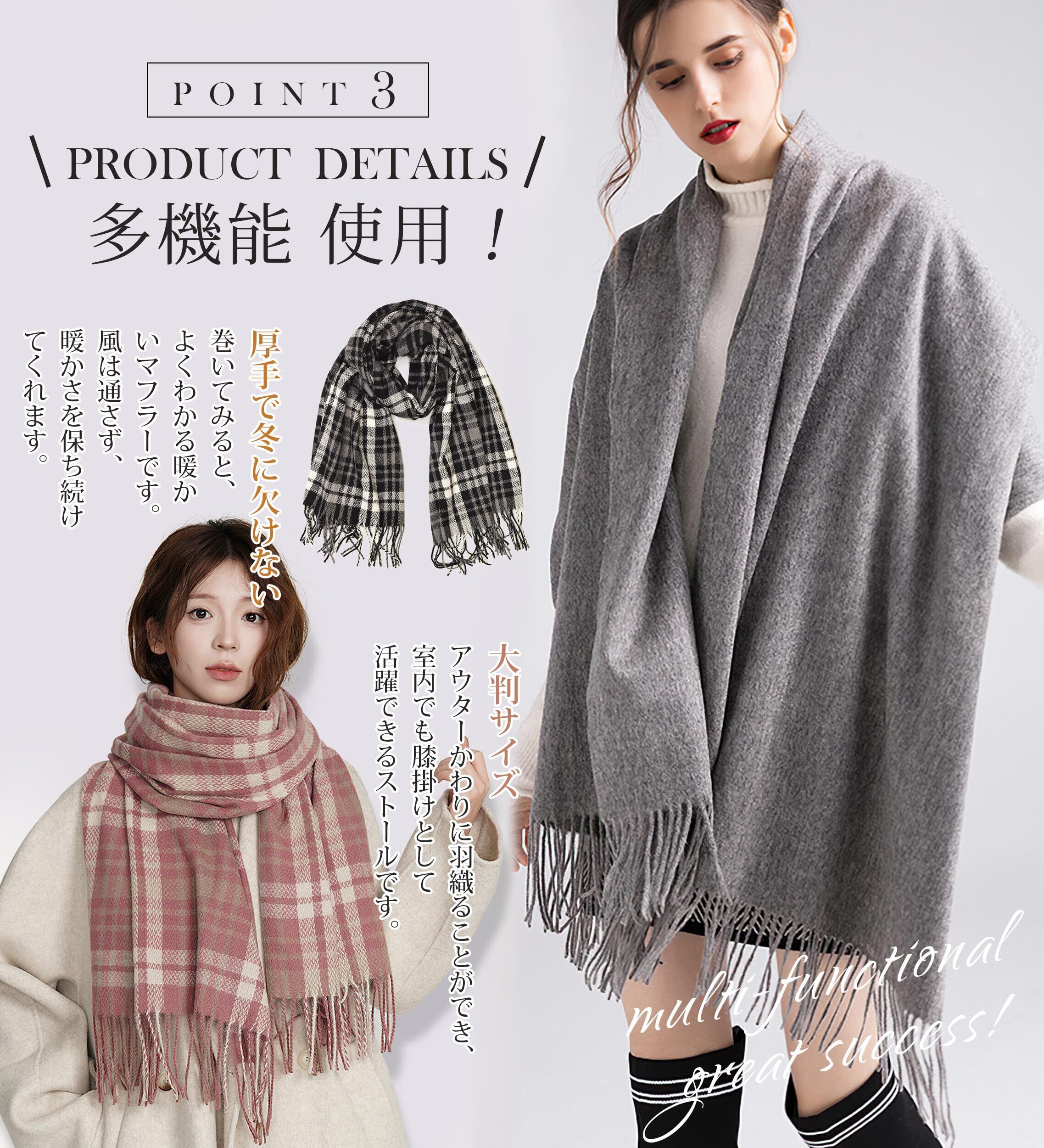 【暖かさとファッションの完璧な融合】 マフラーはゆったりとしたサイズなので、寒い日でも完璧な保温効果を提供します。贅沢な包み込まれる感覚を楽しみながら、厳しい寒さからもしっかり守るマフラーです。レディース マフラーは、洗練されたデザインと優れた保温性を兼ね備えた究極のファッションアイテムです。マフラー レディースはどんなコーディネートにも簡単に合わせることができ、寒さを防ぎつつスタイリッシュに過ごすことができます。日常使いでも特別なシーンでも、 大判ストールが快適さと優雅さをお届けします。