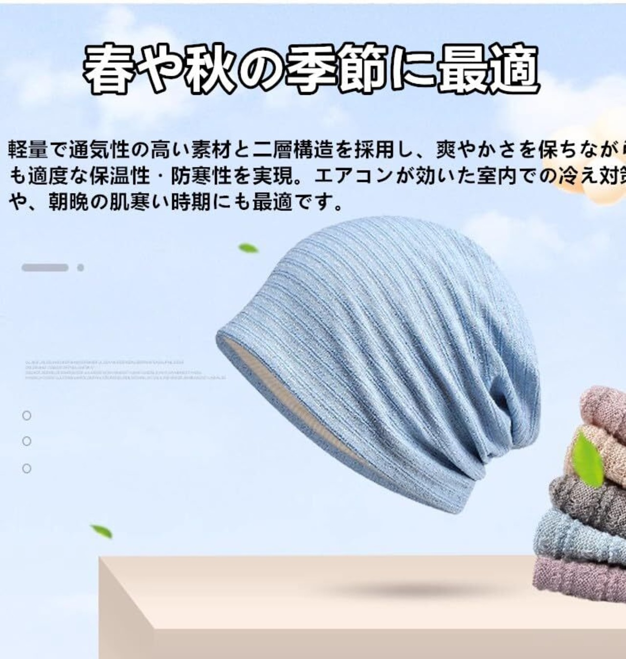 【通気性・肌触り抜群】通気生地を採用して、発汗吸収性、柔らかい肌触りと優しい被り心地がポイントのニット帽です。ふんわりと頭を包み込む軽い被り心地で、ストレスのないフィット感に仕上げます。通気性に富み、汗を吸っても散発性がある事で雑菌の繁殖を抑え、臭いも抑えます。ガーゼのような肌触りで通気性のある生地なので一年を通して使えます。