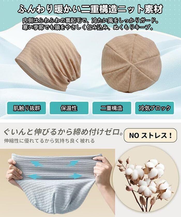 【メイン素材】 綿:フリー 頭周り約54-60cm(平置き 縦:28cm、横幅:28cm)。柔らかく手触り抜群の綿素材を使用し、ふんわりと頭を包み込む軽い被り心地。ストレスのないフィット感に仕上げています。さらに、優れた保温性と防寒性を兼ね備えた生地構造で、春や秋の肌寒い季節でもしっかりと頭部を暖かく守ります。内側の表面はなめらかで素肌に優しく、縫い目もフラットに仕上げているため、長時間の着用でも痛くならず快適です。