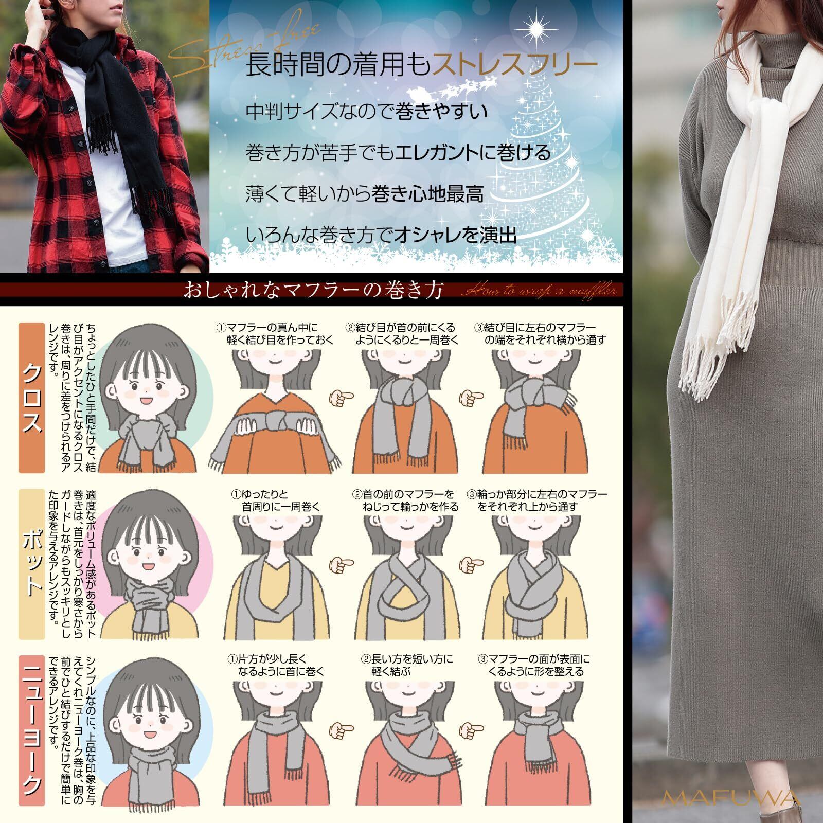 [MAFUWA] 心地よい巻感 ふんわり 軽い マフラー 男女兼用 カシミヤタッチ 暖かい 中判 (35cm×170cm/100g/収納袋付)