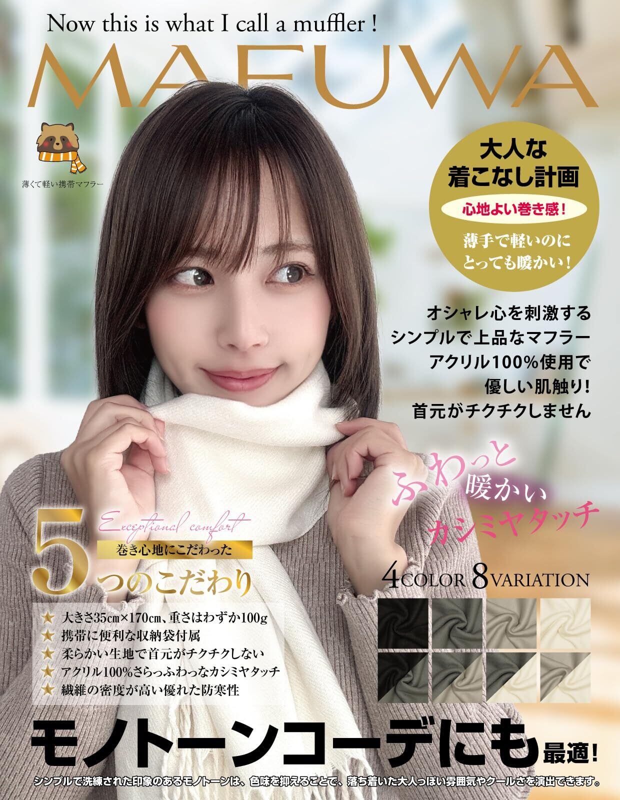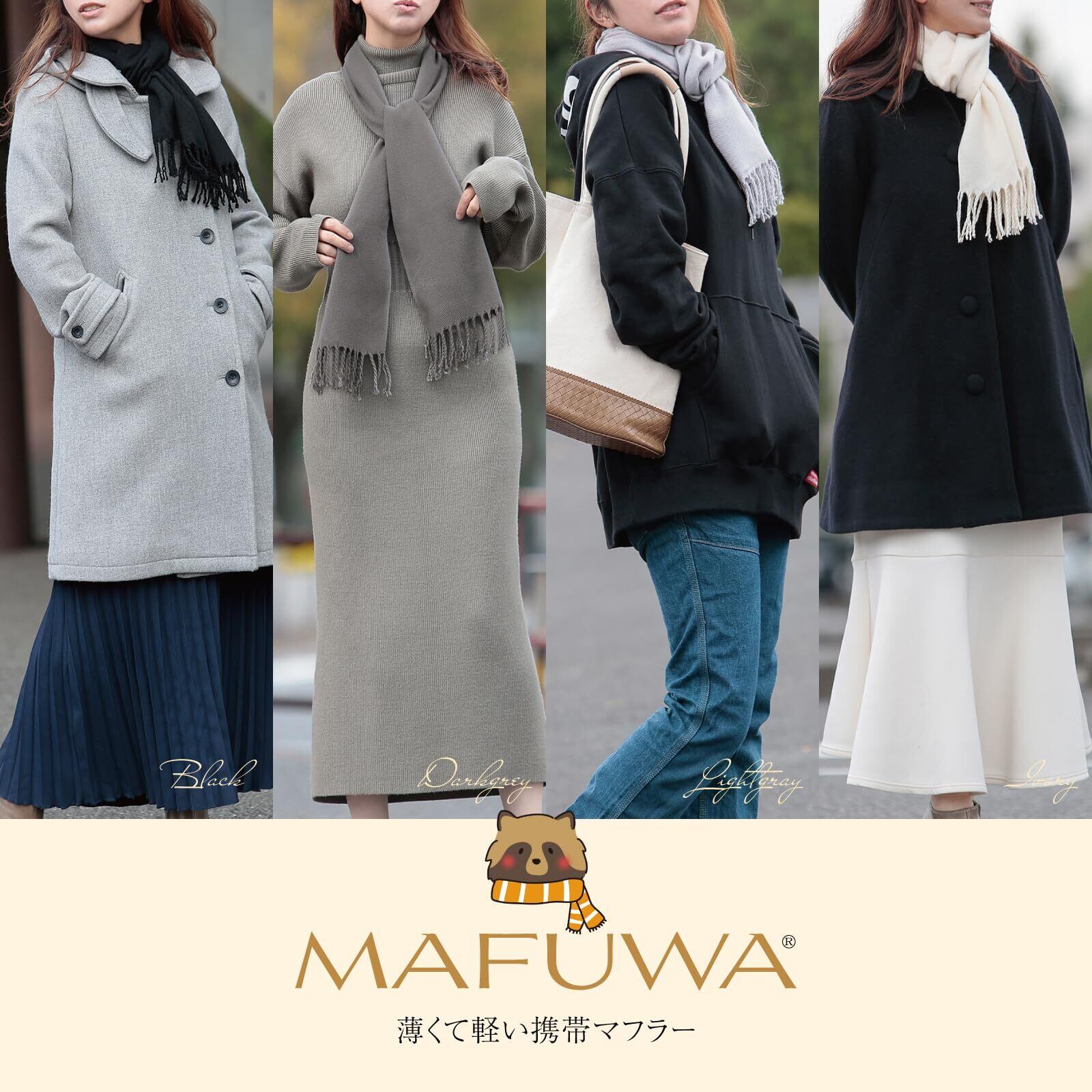 ●幅約35m×長さ約170cm(フリンジ含む)の中判サイズで重さはわずか約100gでとても軽いです。厚過ぎないほどよい生地感で巻き方やアレンジも自由自在です。●高品質のアクリル素材を使用し、生地の密度が高く薄手で軽いのに暖かくしっとりとした優しい肌触りに仕上がっています。●MAFUWAの携帯マフラーは薄くて軽い小さく収納できるマフラーです。折りたたむとコンパクトになりますので、ちょっと肌寒い季節の携帯に大変便利です。通勤カバンやハンドバッグ、トートバッグに入れておくと安心です。●MAFUWAの携帯マフラーは無地でシンプルなデザインですので年齢、性別を問わず幅広い方々にご使用いただけます。カラーはブラック、ダークグレー、ライトグレー、アイボリーと誰もが似合う飽きのこない定番の4色展開です。
