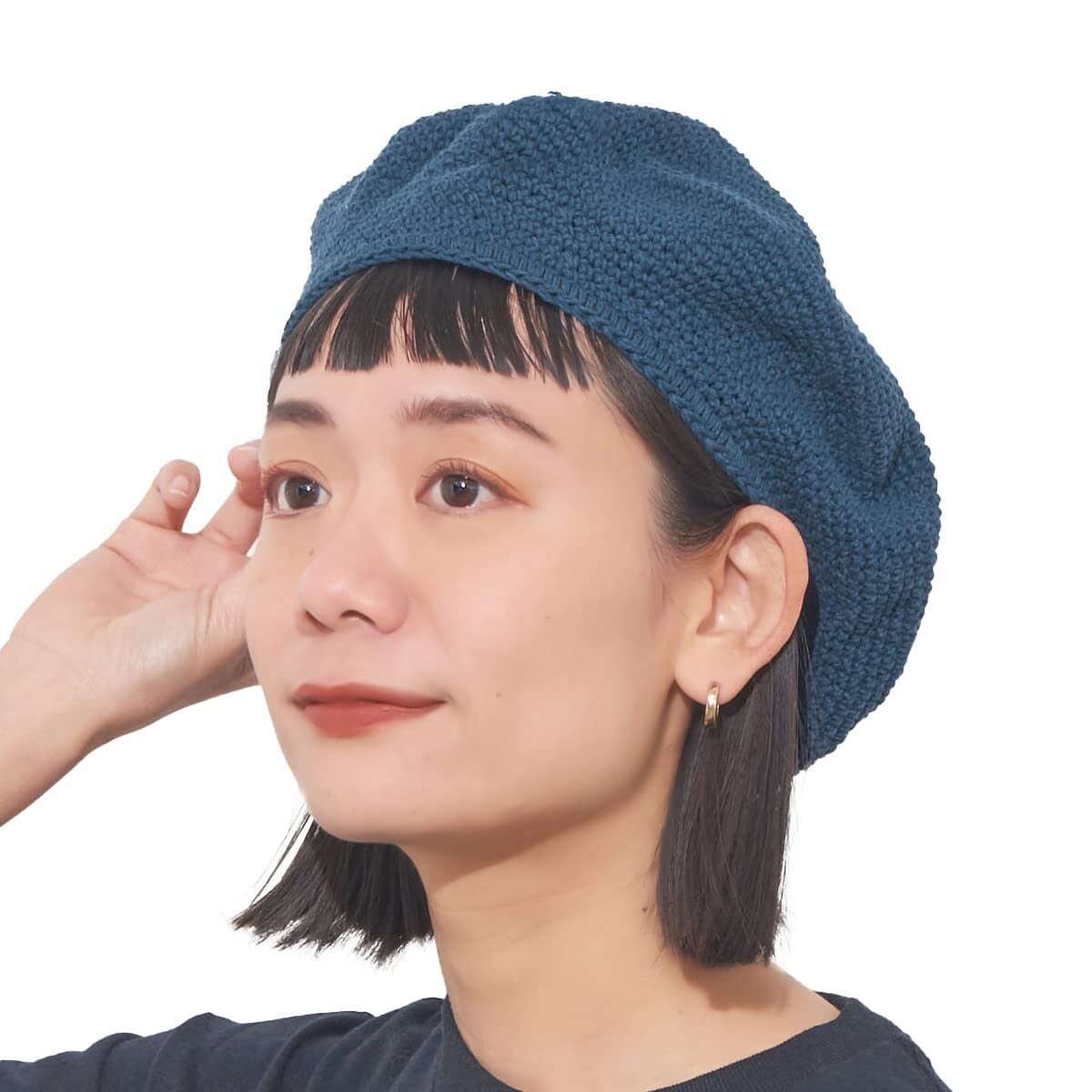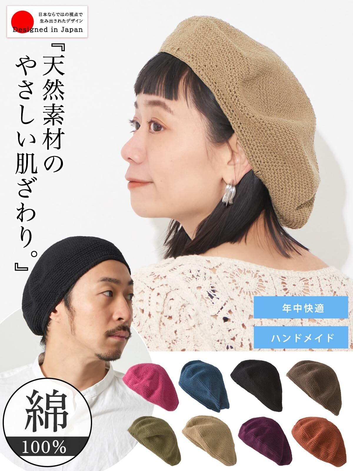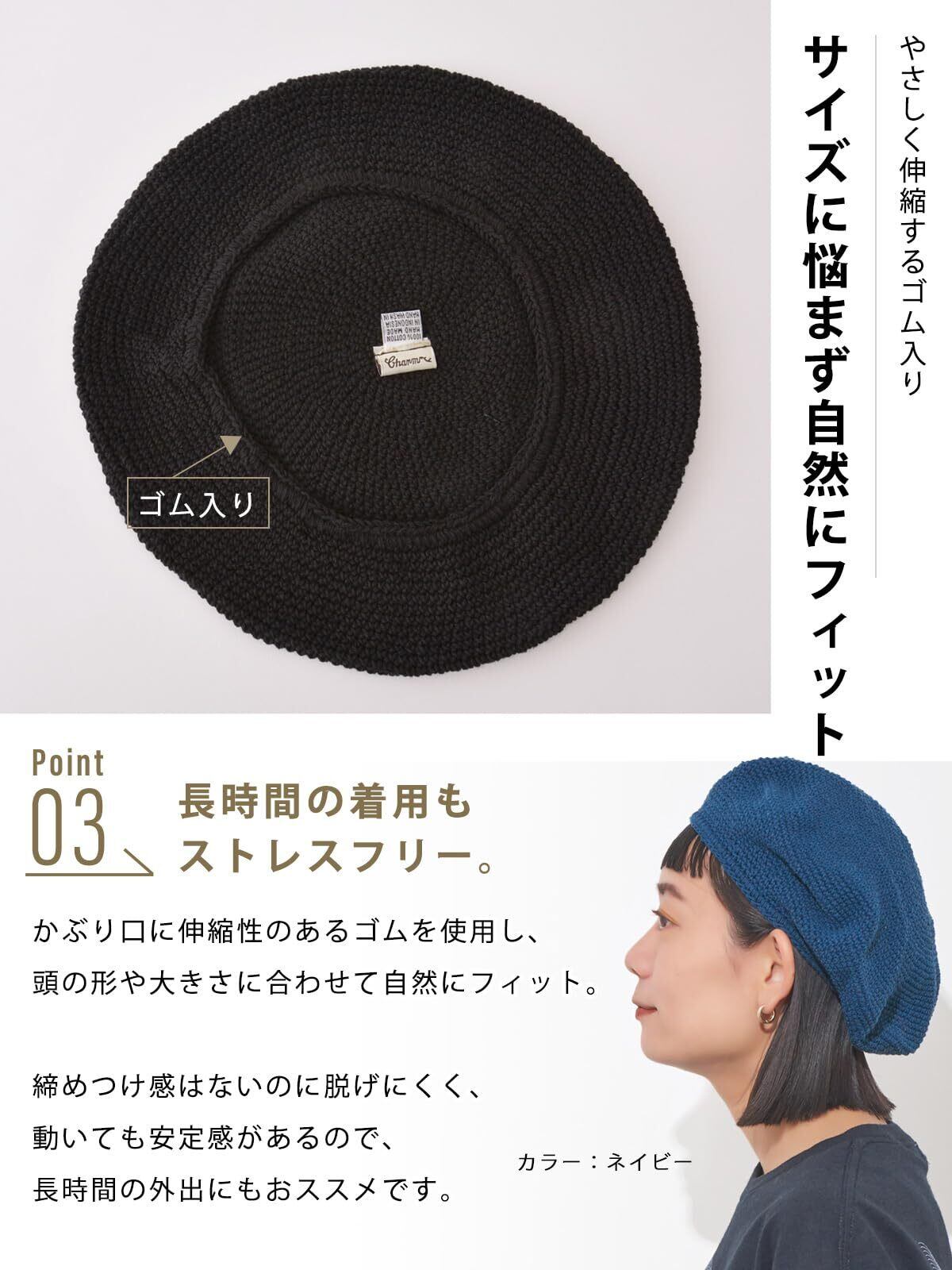 【お肌に優しい綿素材】春夏は通気性が良く、秋冬は暖かい特徴を持つコットン100%を使用したベレー帽子はオールシーズンで快適な着用感。しっかりと編みこまれているので初めは硬く感じますが、使用している間に頭の形に馴染み、かぶりやすくなるのがこのニット帽子の良さ。