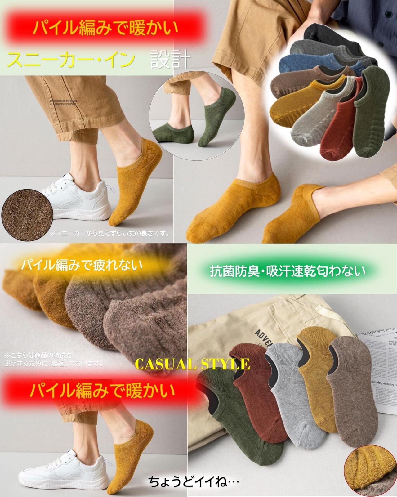 【kuuupiiiさわやか底パイルスニーカーインソックスの着用シーン】 オフタイムでのデニム、綿パンツ、などのカジュアルスタイルでの着用はもちろんですが、 スポーツなどのシーンでのご着用も推奨いたします。 学生さんから奥様まで、年齢に関係なく幅広い方々にご着用いただけ、10足の各カラーにて着用のシーンが広がります。 毎日の生活シーン、着用されるスタイルに合わせてご着用のカラーをお選び下さい。