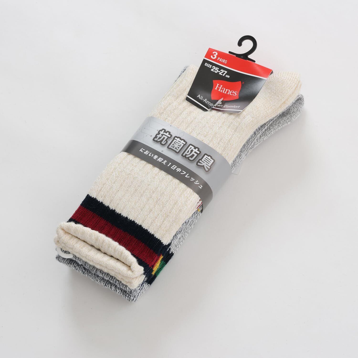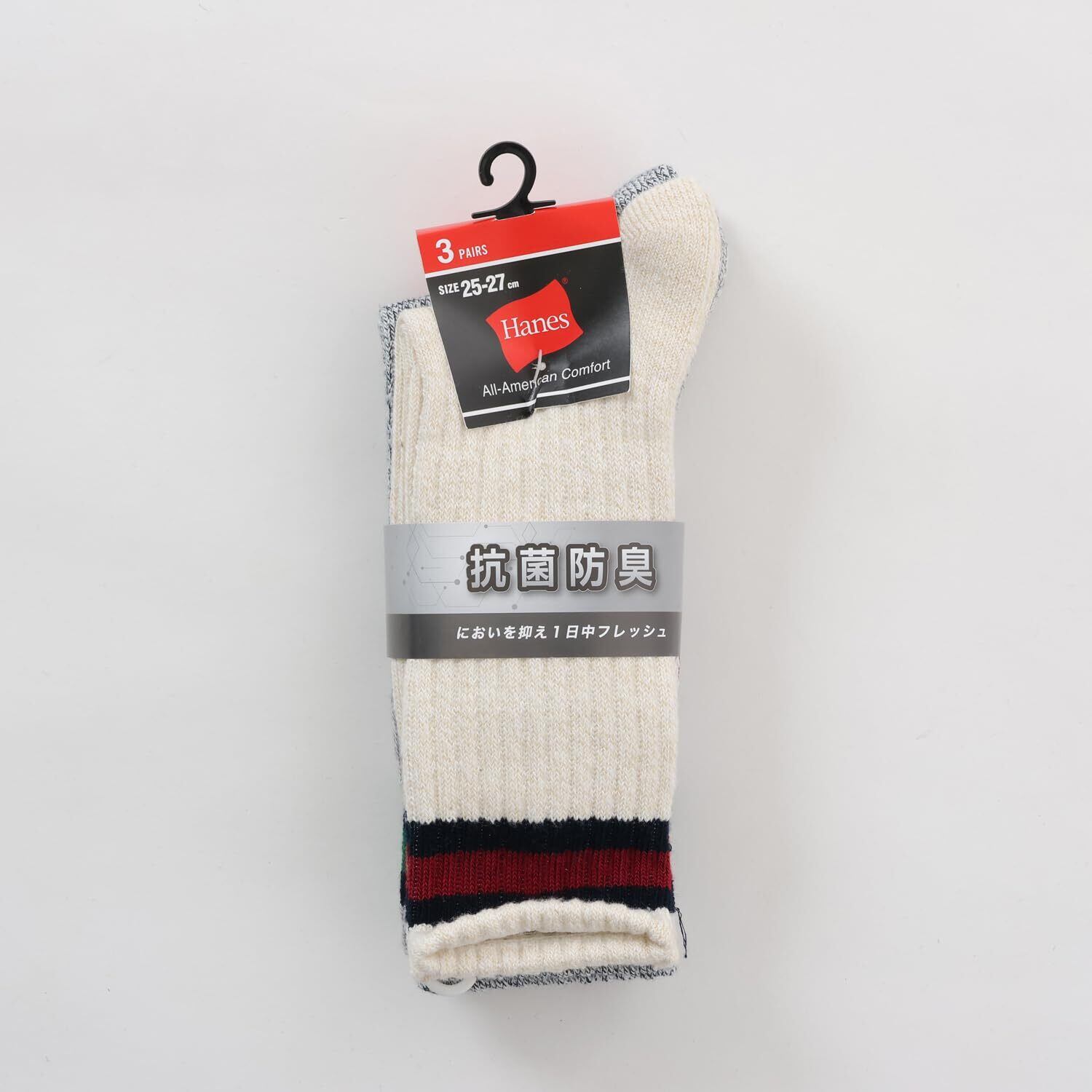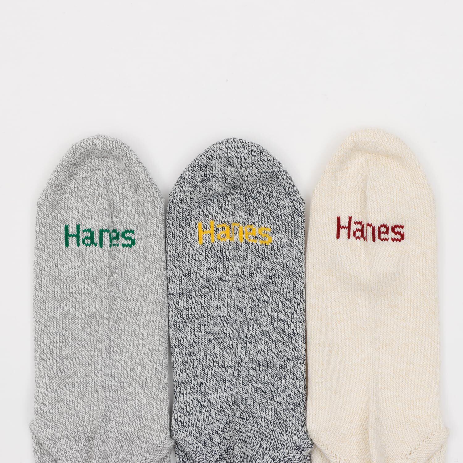3足組フルレングス丈ノンパイル仕様の抗菌防臭機能付きライン入りカジュアルソックスです。異なる2色を使った撚り杢糸(よりもくいと)による独自のカジュアルな色合いが特長。足裏にさり気なくアクセントカラーでHanes®(ヘインズ)ロゴを入れました。3色カラーアソート。
