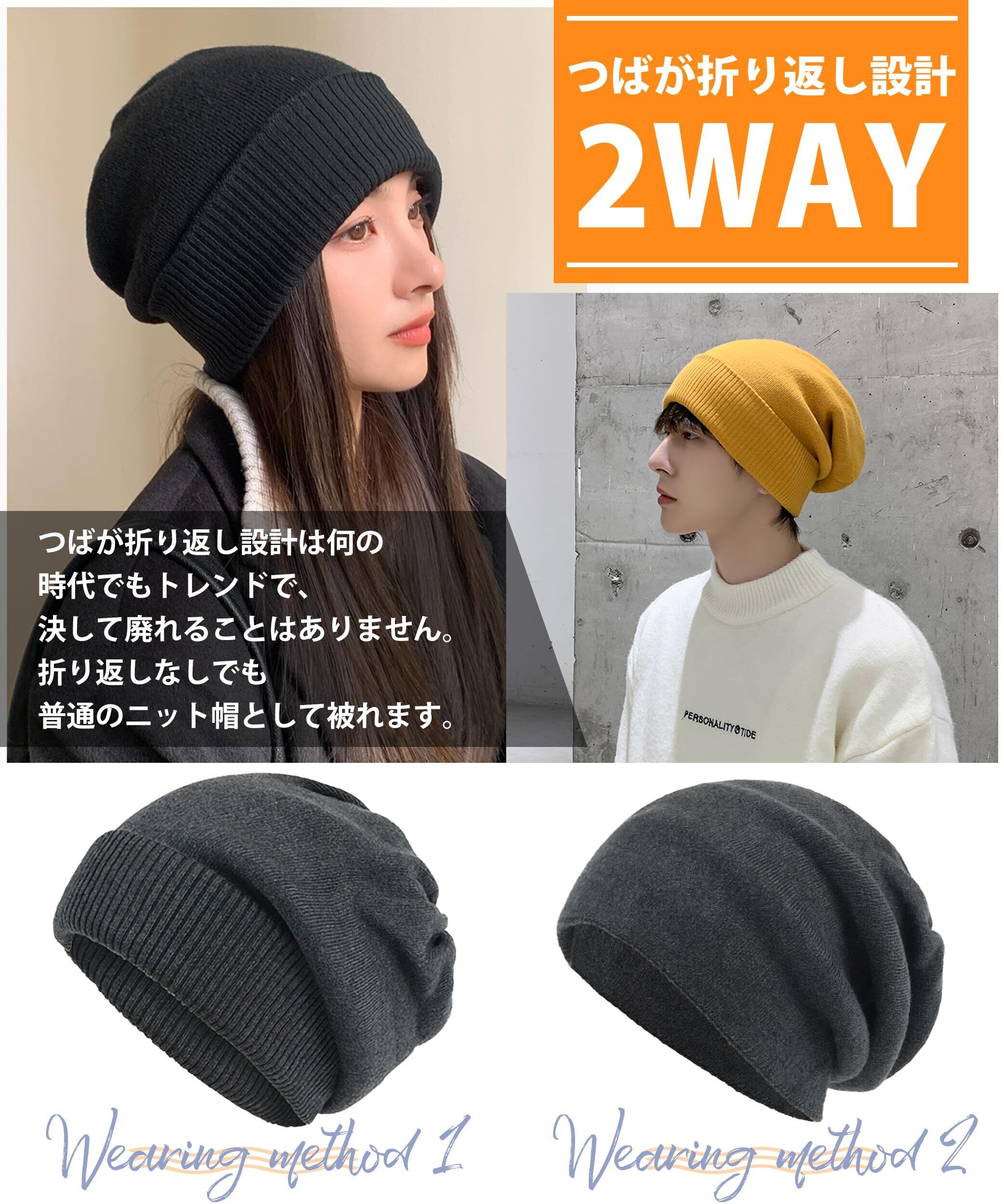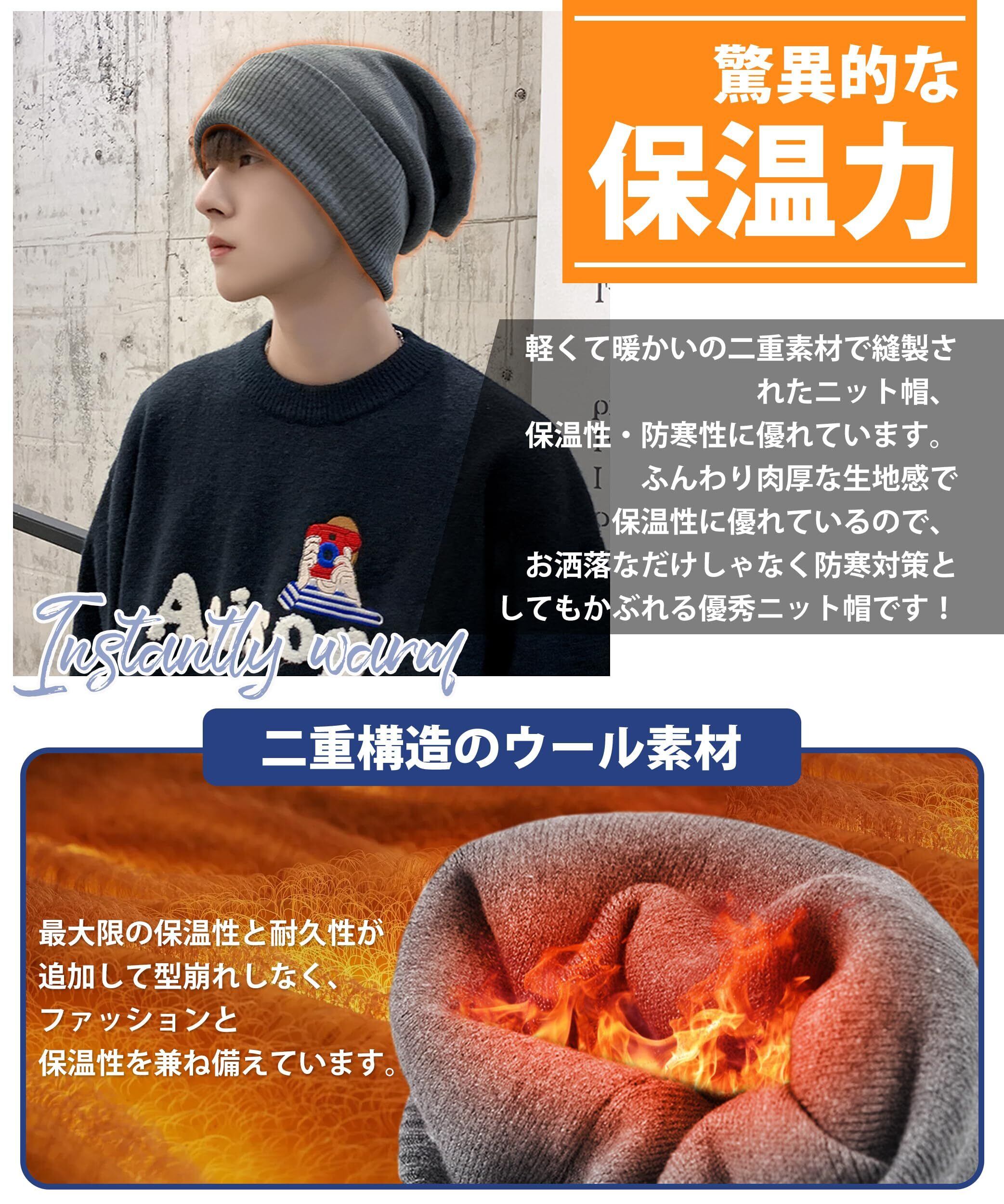 【二重構造・冬最強の暖かニット帽】軽くて暖かいの二重素材で縫製されたニット帽、保温性・防寒性に優れています。やわらか素材でふんわりと頭を包み込む軽い被り心地、ストレスのないフィット感に仕上げています。寒い日にニット帽を耳に引き寄せたり、頭や耳を保温するのに十分な暖かさを提供します。ふんわり肉厚な生地感で保温性に優れているので、お洒落なだけしゃなく防寒対策としてもかぶれる優秀ニット帽です!冬の防寒対策として絶対欠かせないアイテムです。