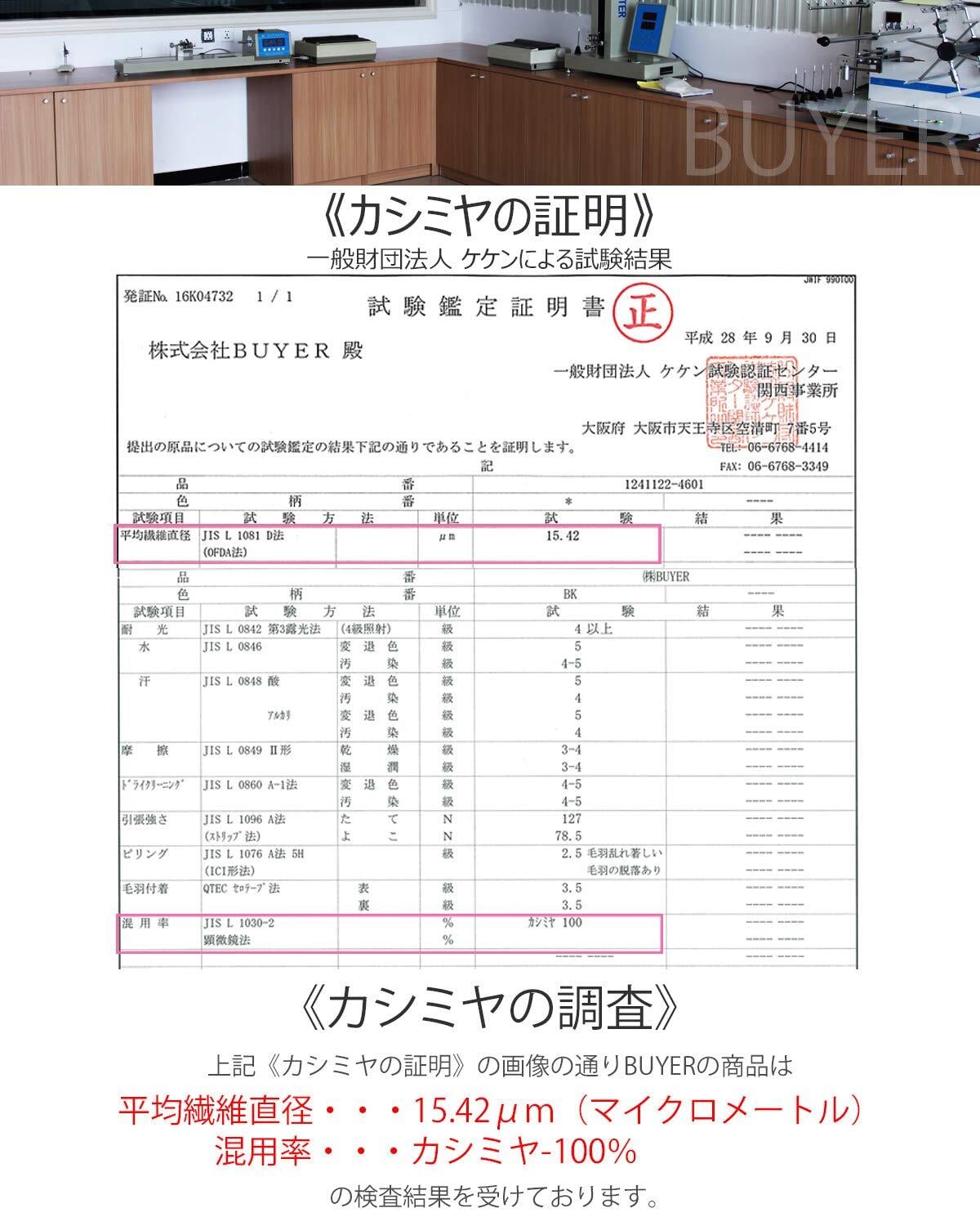 【証明】カシミヤ試験鑑定書取得済み(一般財団法人 ケケン試験認証センター)