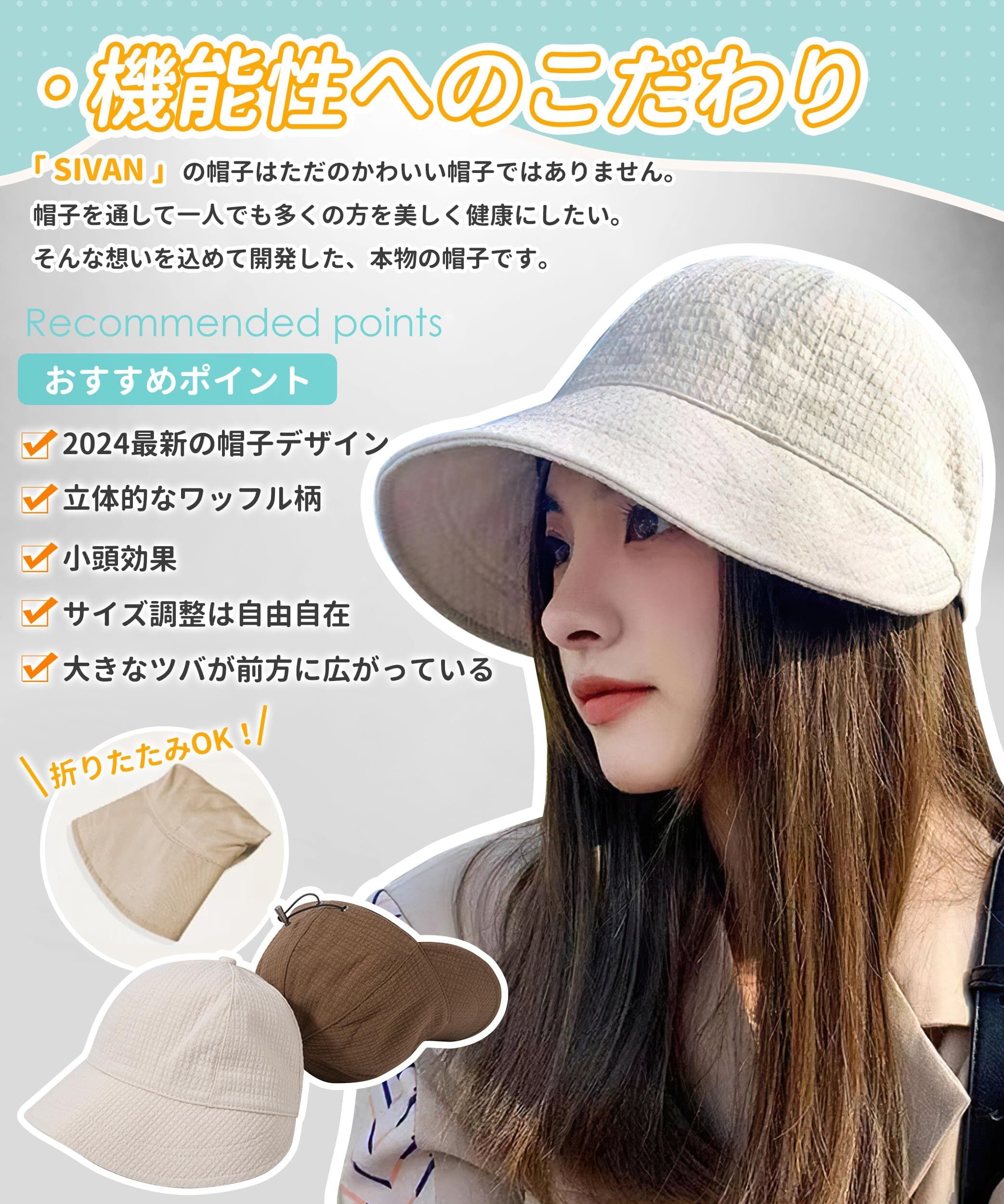 [SIVAN] UVカット帽子 レディース 【立体的なワッフル柄・ 圧倒的な小顔効果・ 大きなツバが前方に広がっている・UPF50+】 日除け帽子 日焼け防止 吸汗排湿 深めタイプ サイズ調節 夏 キャップ 帽子