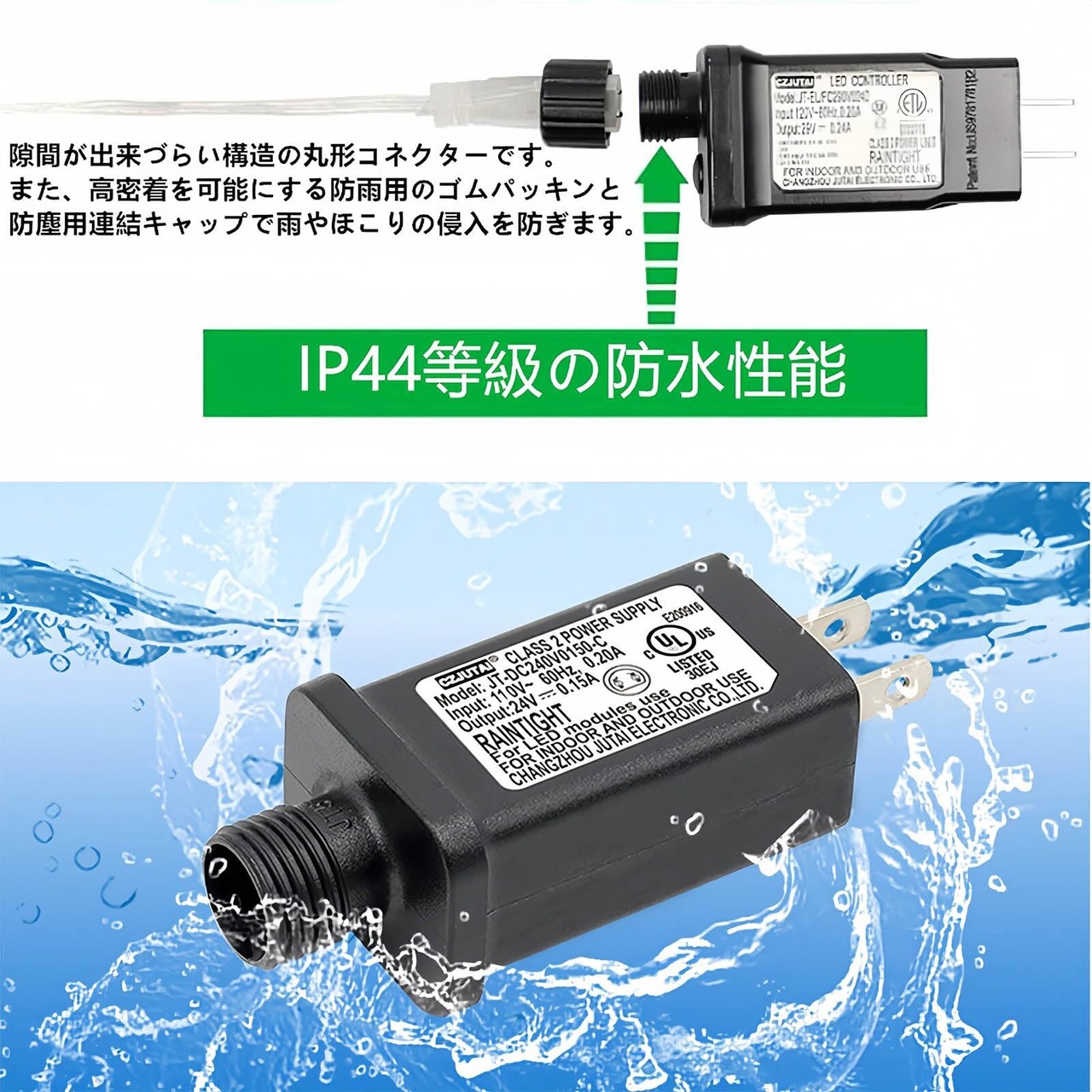 【注意事項】付属の31V 0.2A給電器は防水ではありません。LED部分は防滴加工ですが、屋外や雨風などが当たる場所でのご使用の際には【プラグ部分とリモコン部分】の防水処理を怠らない様お気を付けない下さい。