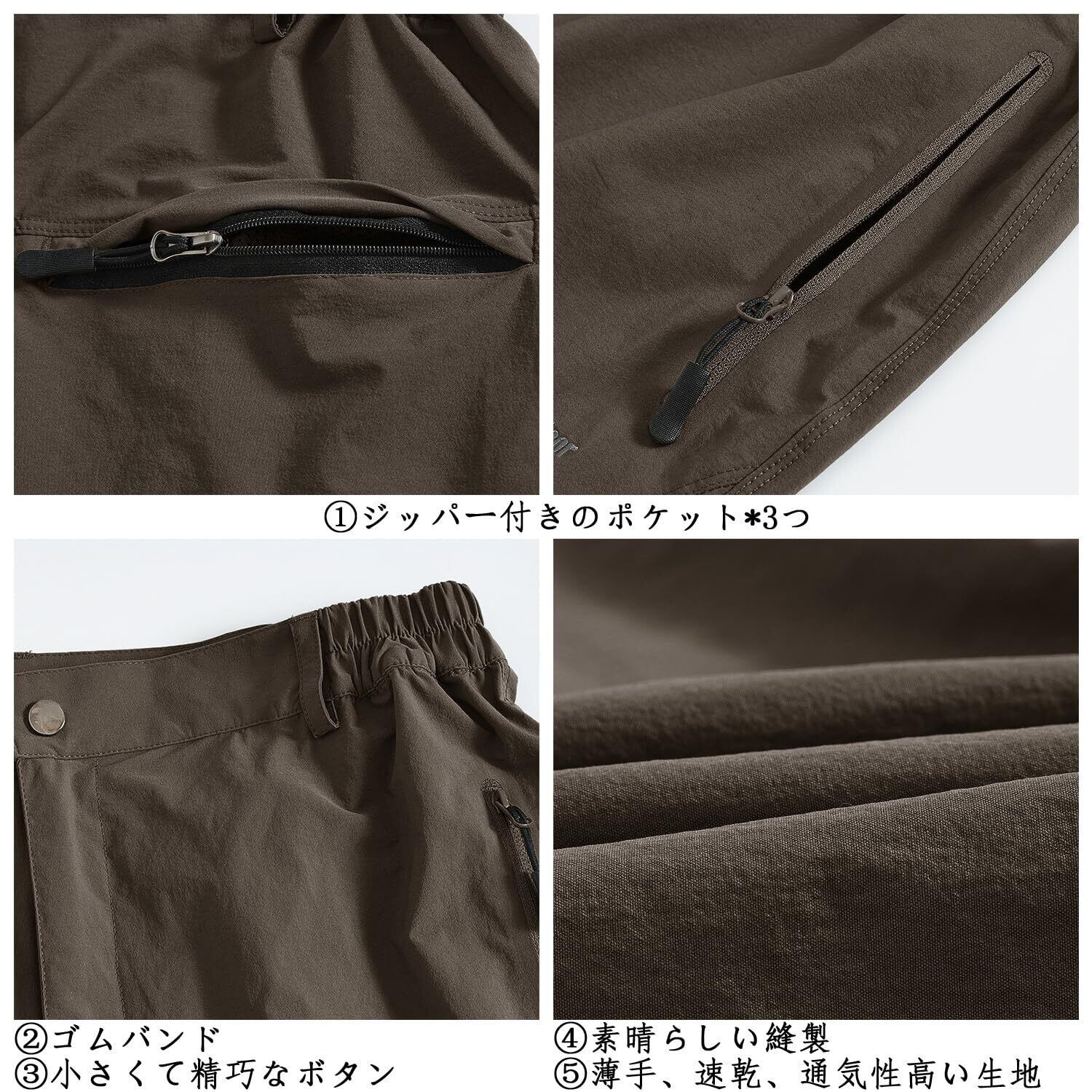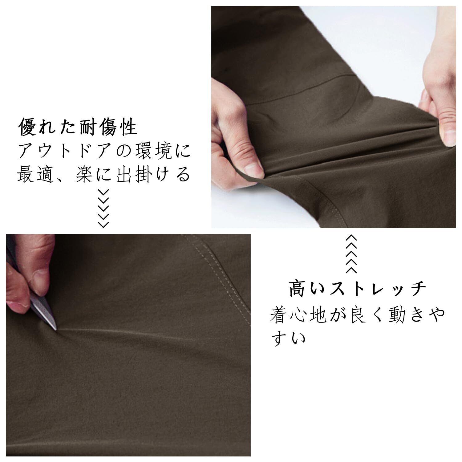 素材構成:88%NYLON +12%SPANDEX。アウトドア、特に山登り向けのロングパンツのため、普通により、撥水、高い通気性、伸縮性、動きやすさ、汗を吸ってすぐ乾くなどの優れた機能性を持つ。