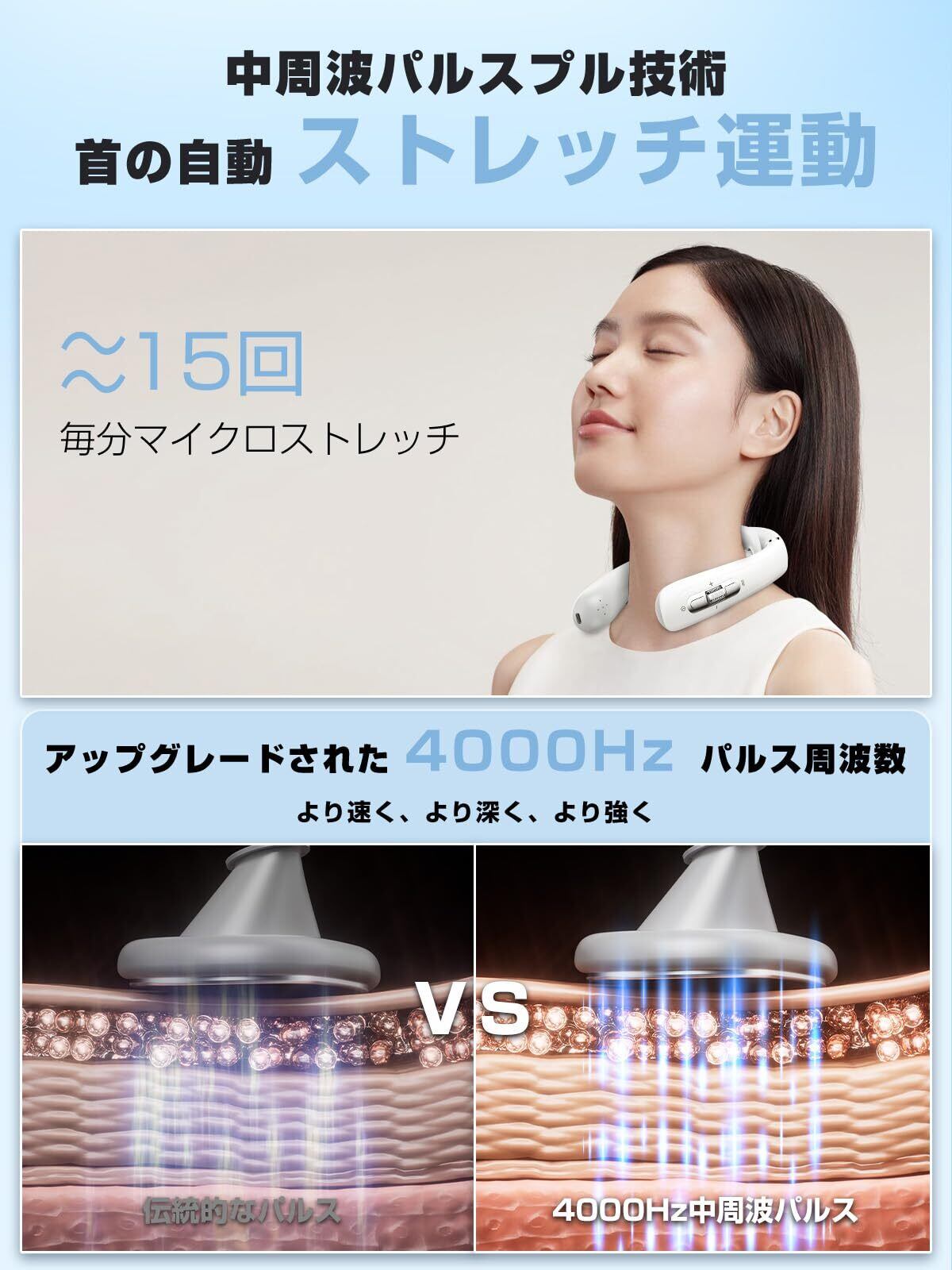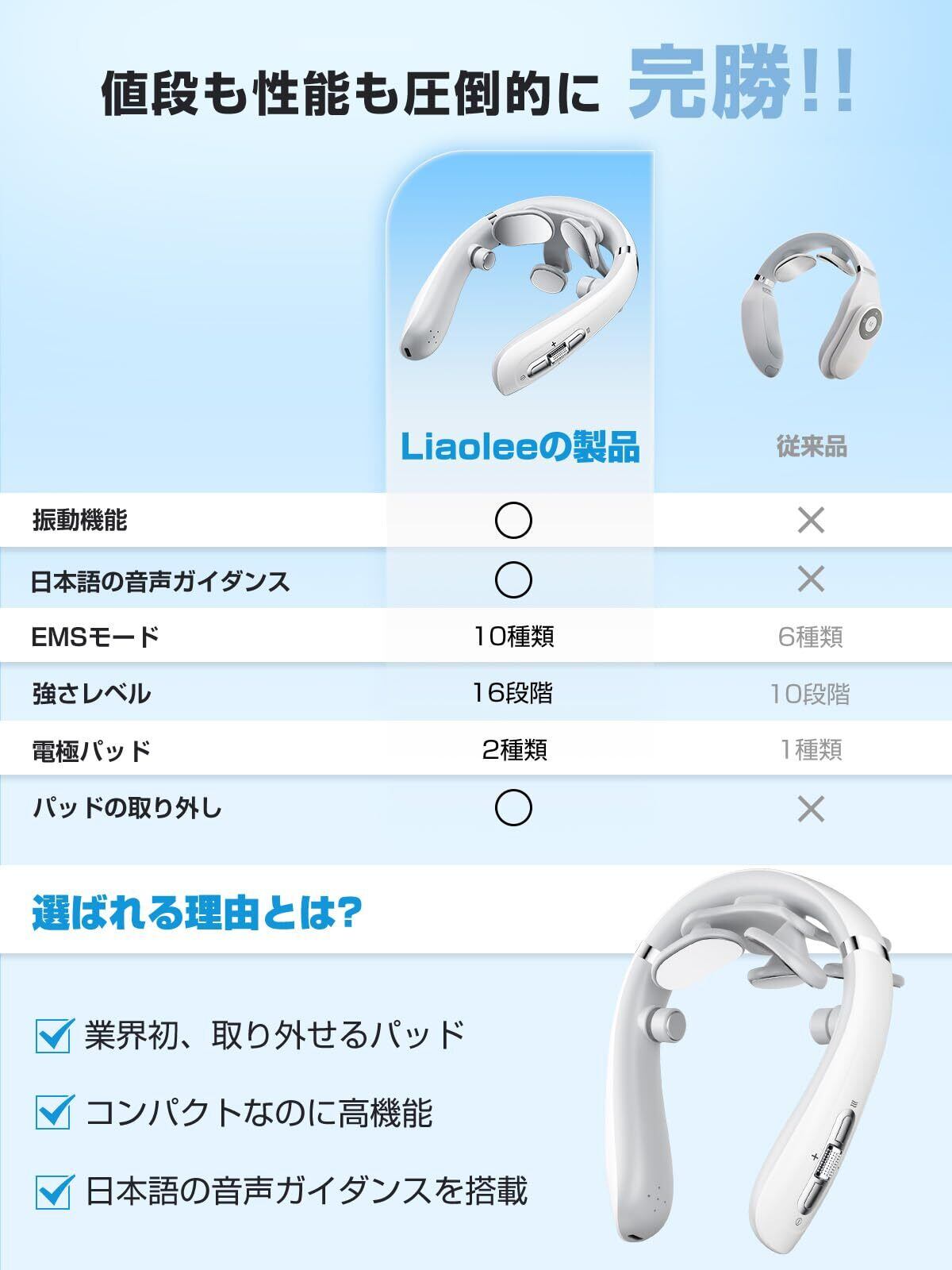 【広範囲を刺激】既製品に比べてもっと強く、気持ちいい“両側振動パッド”を搭載。従来品は襟足のみのケアでしたが、このリラクゼーション器のケア範囲は首の首の両側まで広がります。 さらに驚くべきことに、集中ケアパッドと広範囲ケアパッドの両方を備え、1台のliaoleeネックリラックス器は従来の2台のリラックス器の機能に相当する。
