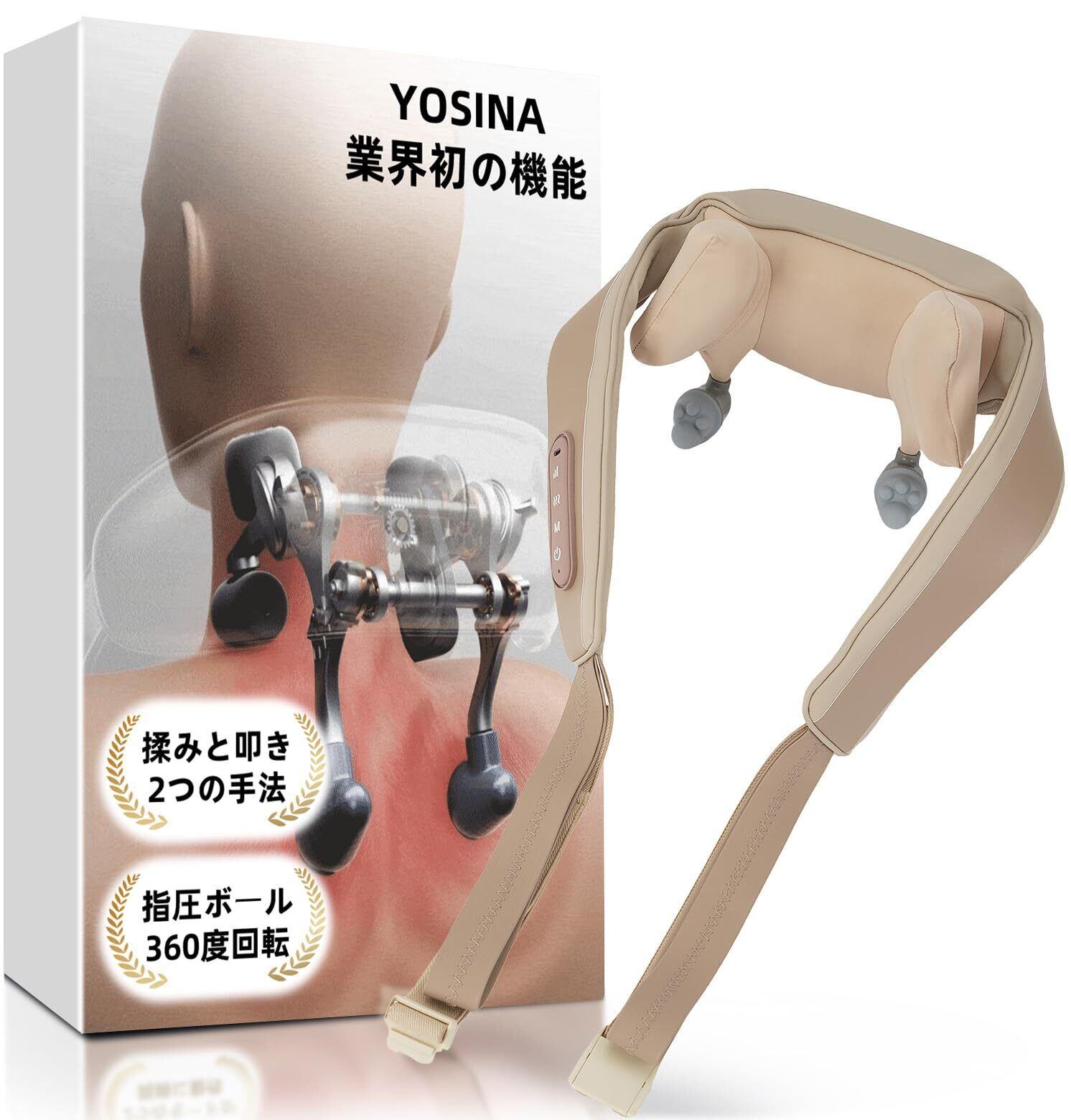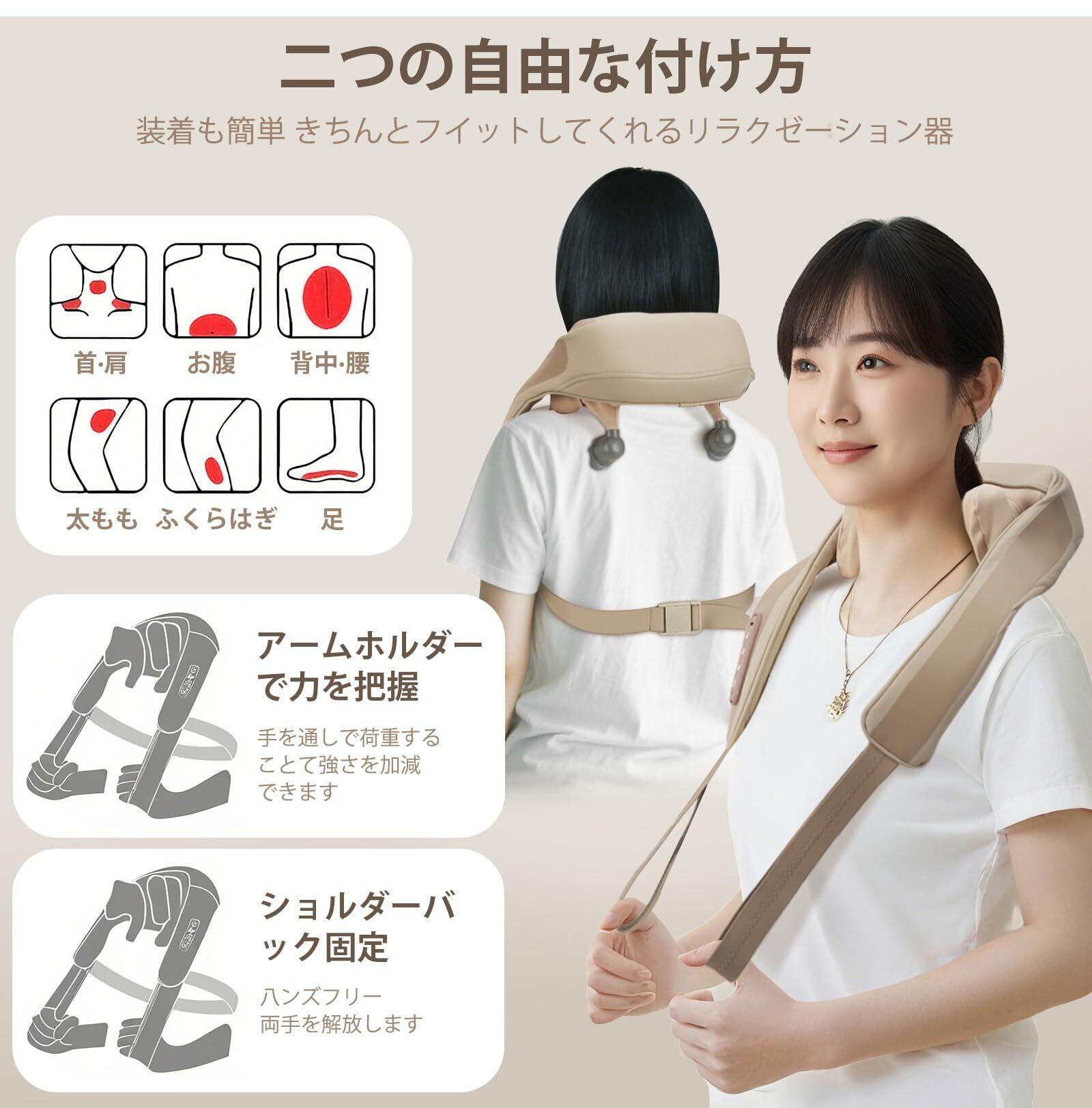 【首や肩甲骨を幅広くケアします】4つのもみ玉と、首にしっかりフィットする手もみアームが、首と肩の筋肉に深く刺激を与えます。