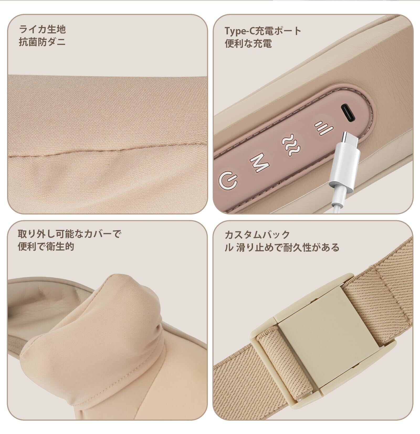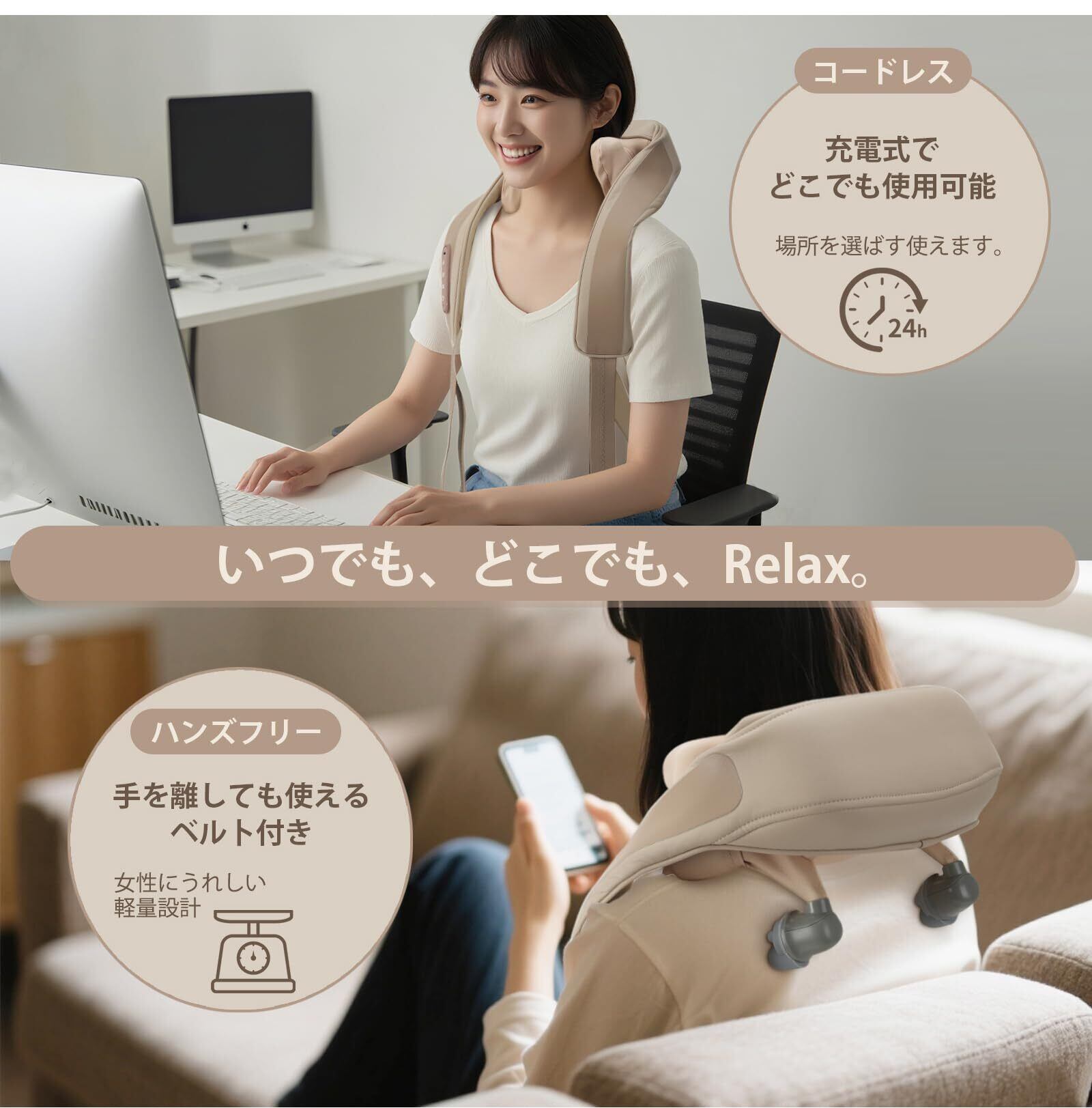 【 コードレスでどこでも快適。自分のケアを、もっと手軽に 】… コードレス・充電式のため、場所を選ばず使えるのも嬉しいポイント。 コンセントのそばに座らなくても、ソファでくつろぎながら、ベッドで横になりながら、シーンを選ばず使用可能です。 さらにハンズフリー設計なので、装着したまま読書やテレビ視聴、家事やパソコン作業などもスムーズ。