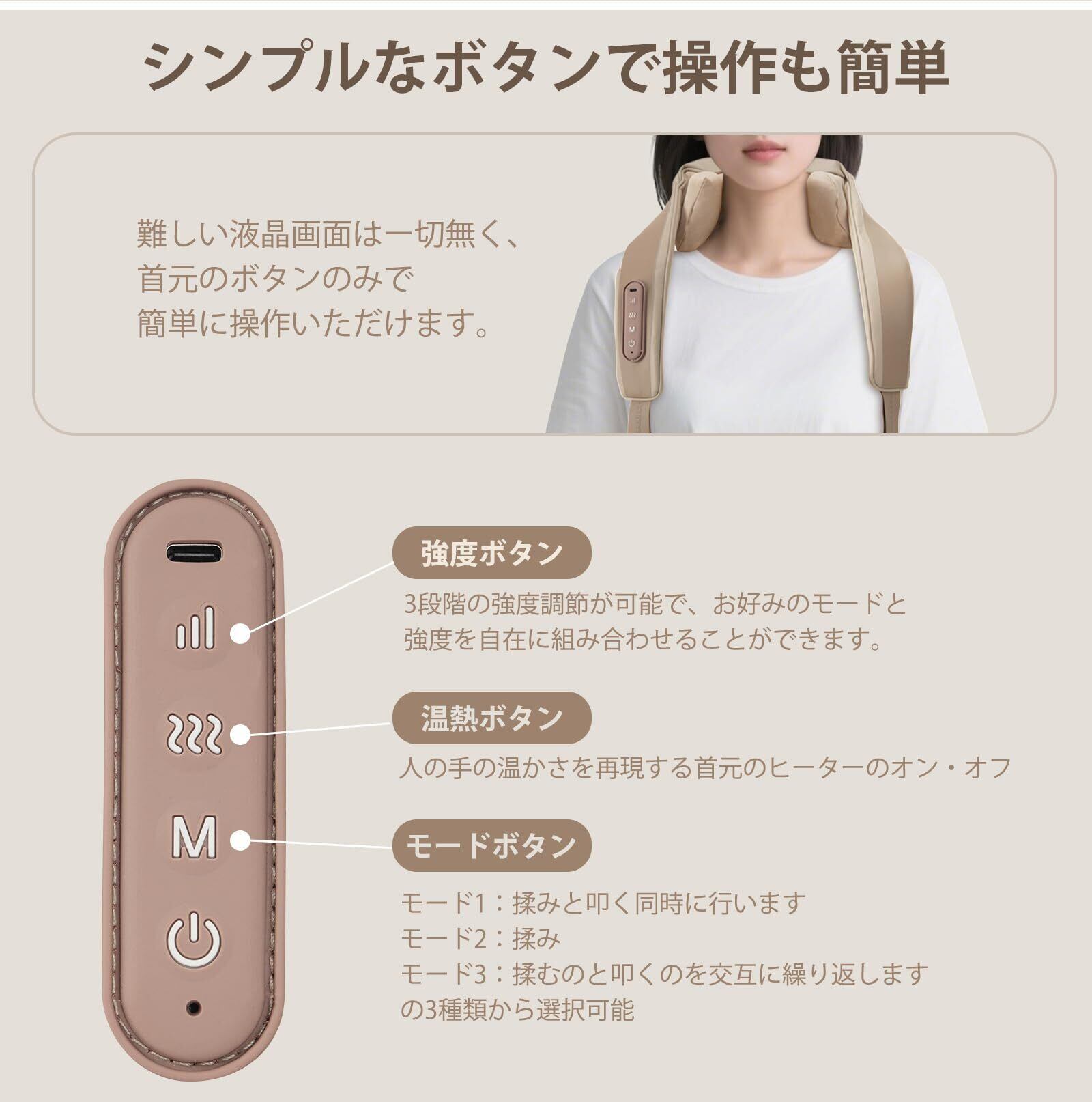 【3種類のモード、強さ3段階、温熱機能】プロの技を再現した3種類のリフレッシュモードを搭載しており、家にいながら充実したリラクゼーション体験を楽しむことができます。3段階の強度調節が可能で、お好みのモードと強度を自在に組み合わせることができます。また、温熱機能も搭載しており、トータルケアも可能です。