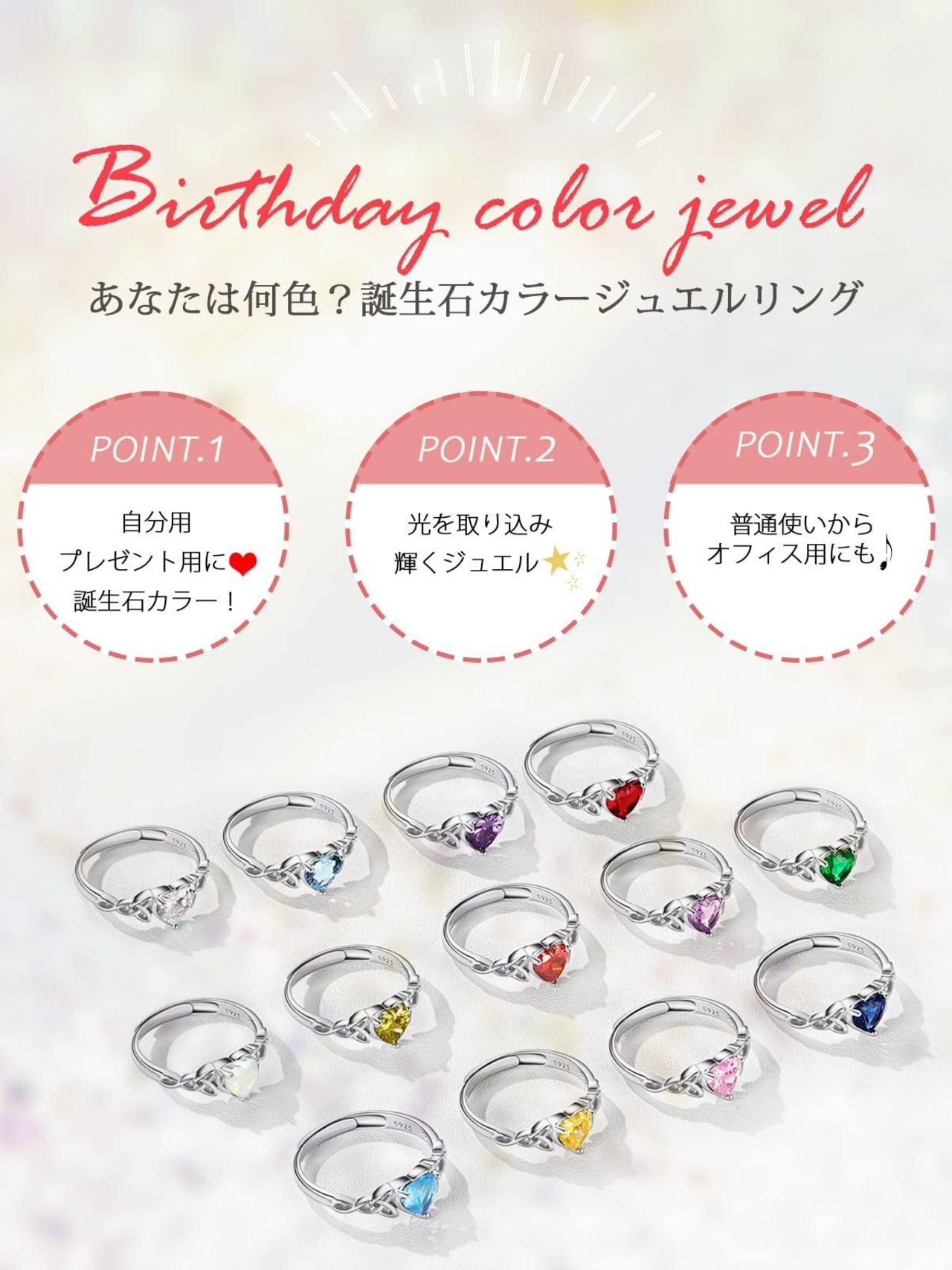 [誕生石リング] (1月)ガーネット、(2月)アメシスト、(3月)アクアマリン、(4月)ダイヤモンド、(5月)エメラルド、(6月)アレキサンドライト、(7月)ルビー、(8月)ペリドット、(9月)サファイア、(10月)ピンクトルマリン、(10月)オパール、(11月)トパーズ、(12月)タンザナイトの13種類の誕生石からお選びいただけます。