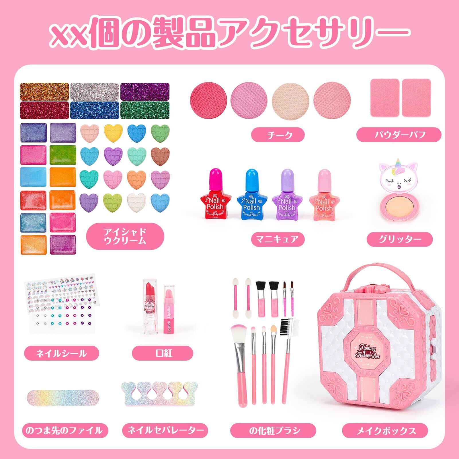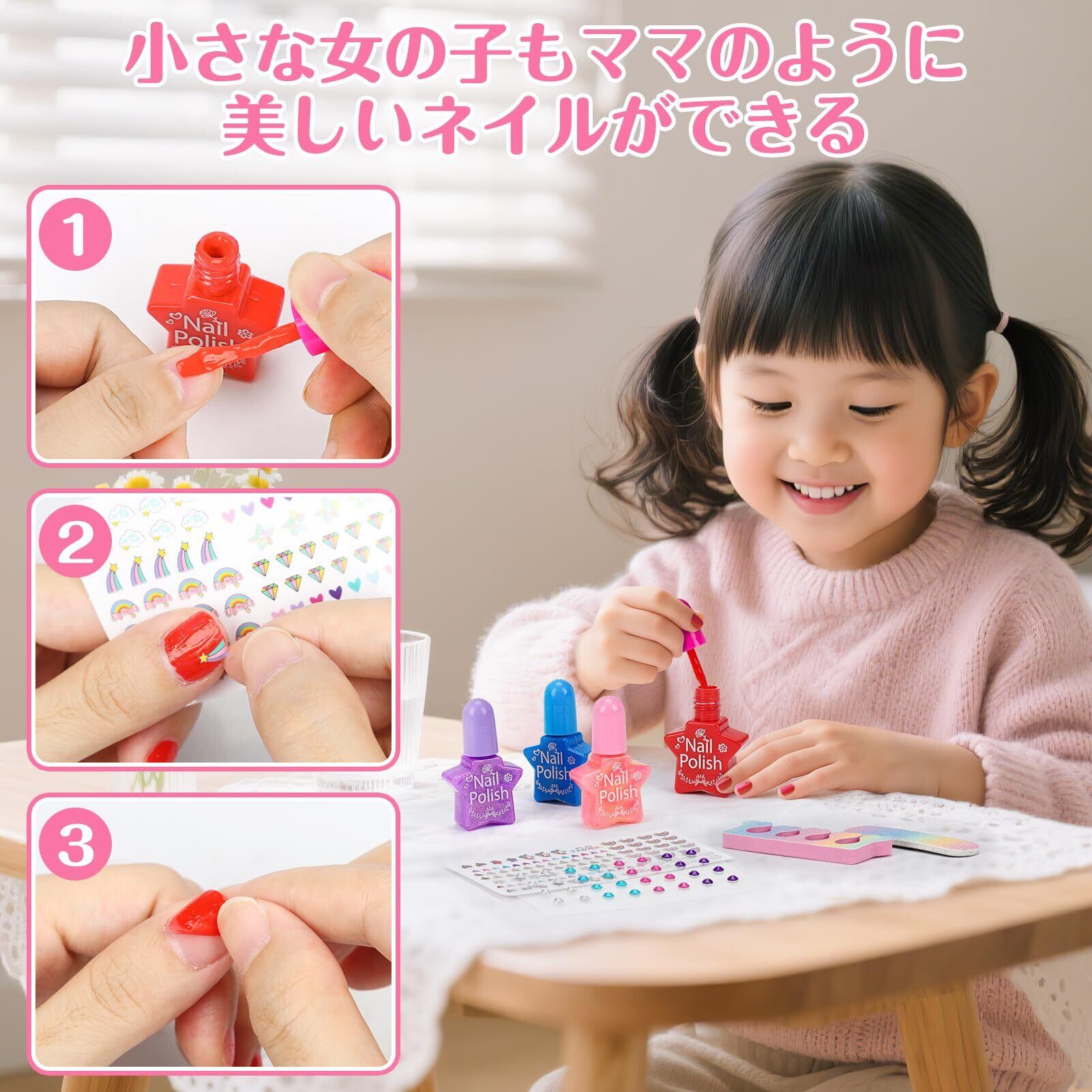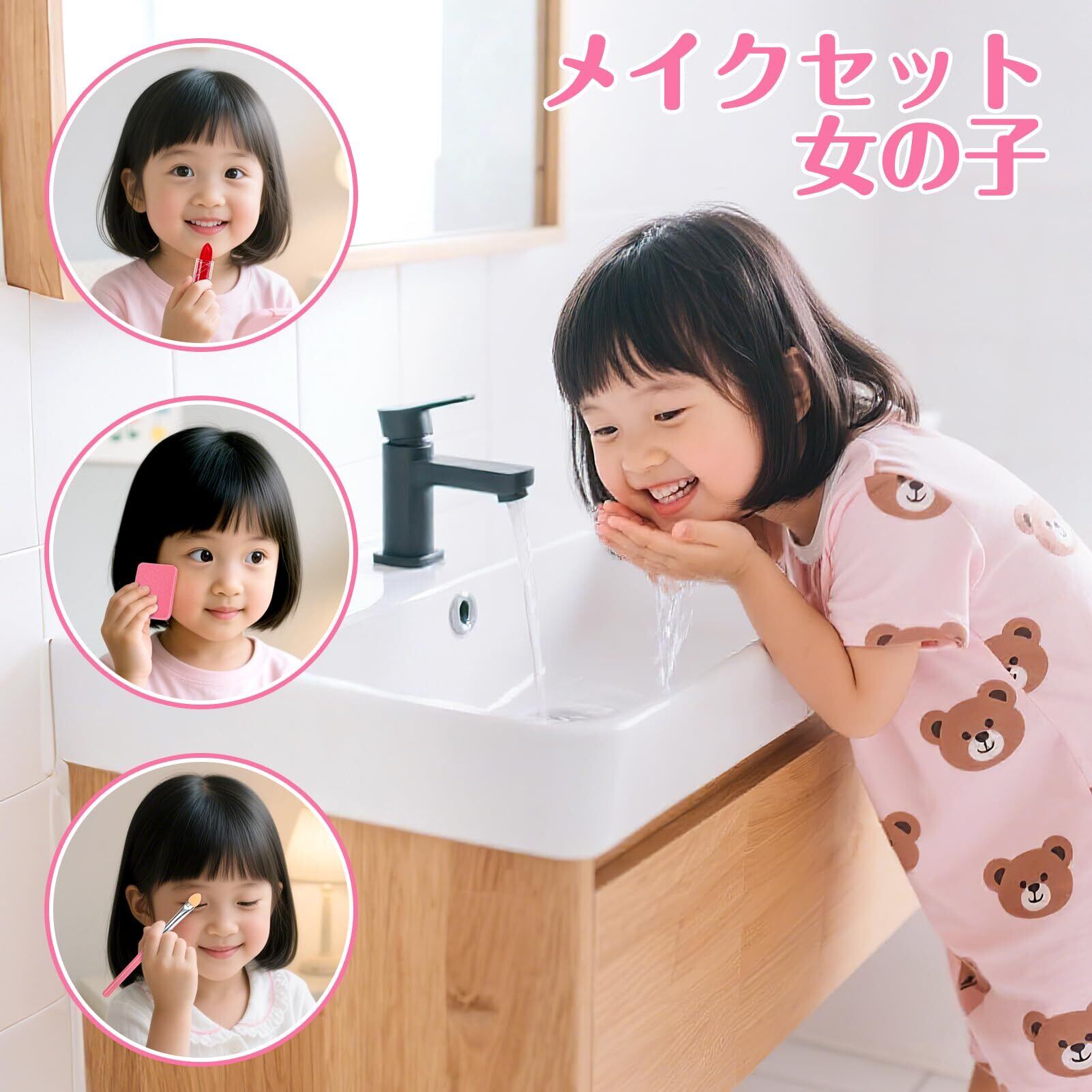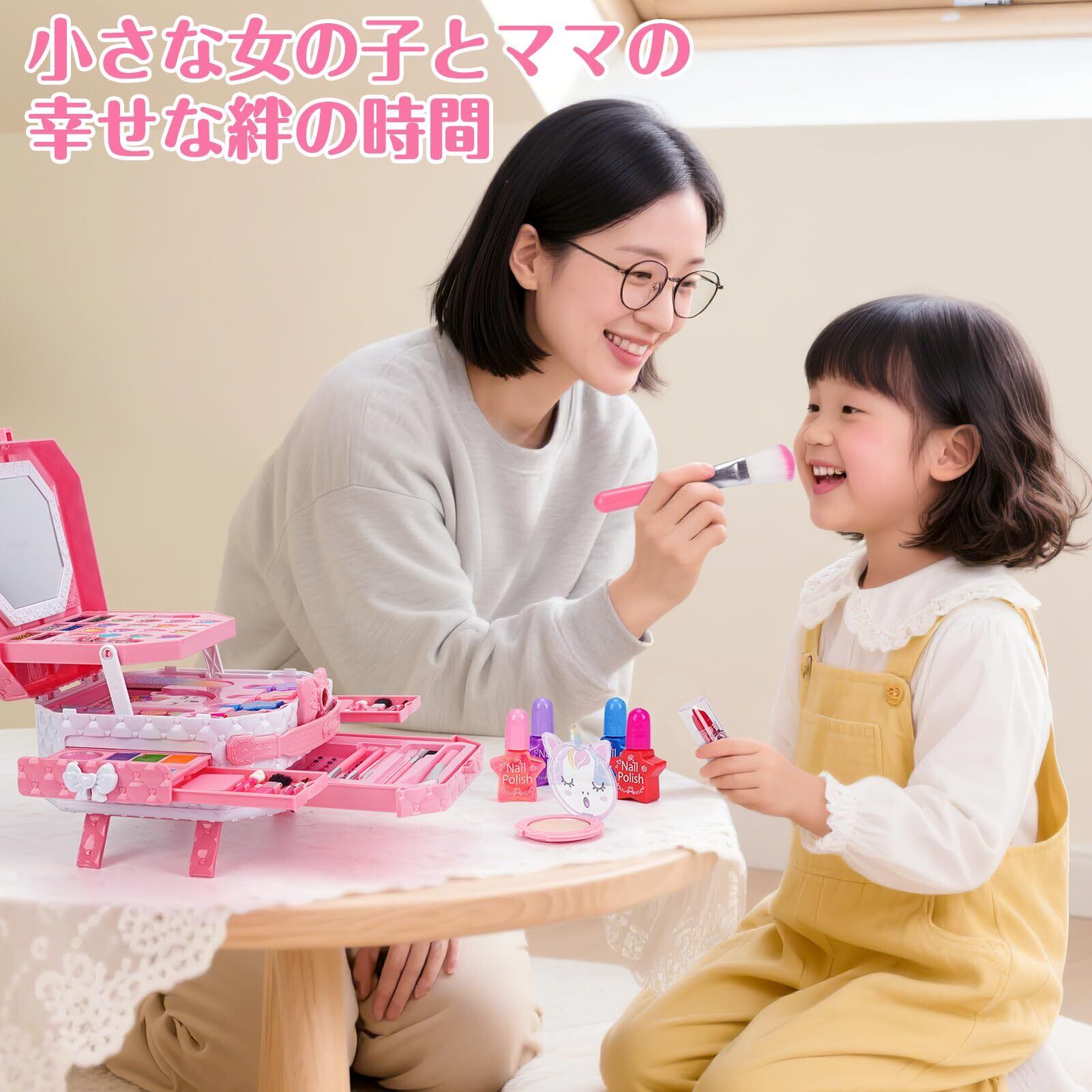 女の子 おもちゃ:この子ども用化粧品は、無害な成分で作られており、石けんと水ですぐに洗い流せます。お子様の肌に優しく安全なため、ママも安心してお使いいただけます。(※ご使用前に、耳の後ろなどでパッチテストを行い、アレルギー反応がないかご確認ください。)