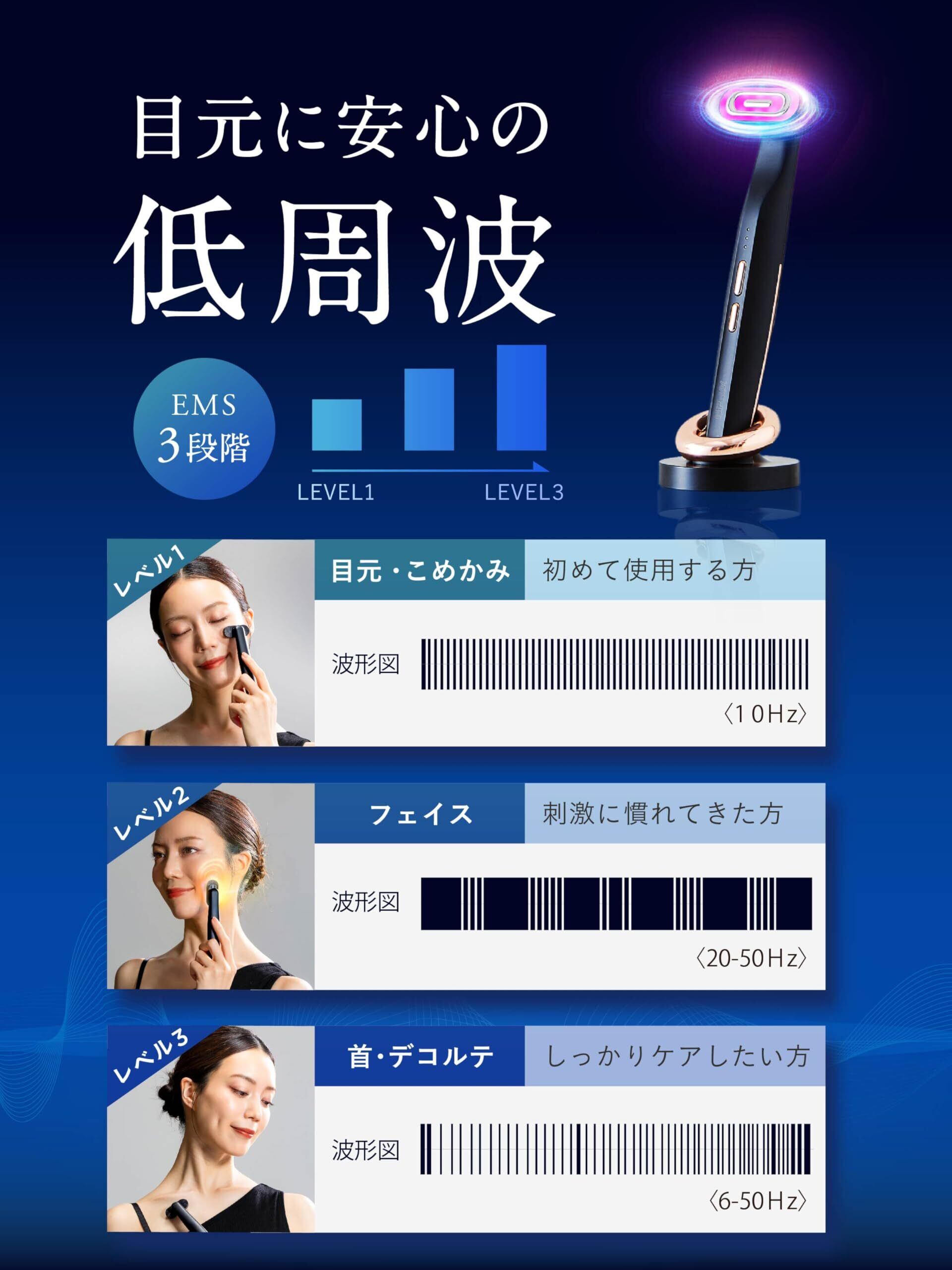 【REFINE EYEこだわり機能】・立てて収納できる充電台付き。・超軽量:約52g。・安心の防水規格:IPX4。・肌検知機能:肌に触れると自動開始。・使用可能部位:フェイスライン、口元、目元、こめかみ、額、デコルテ。