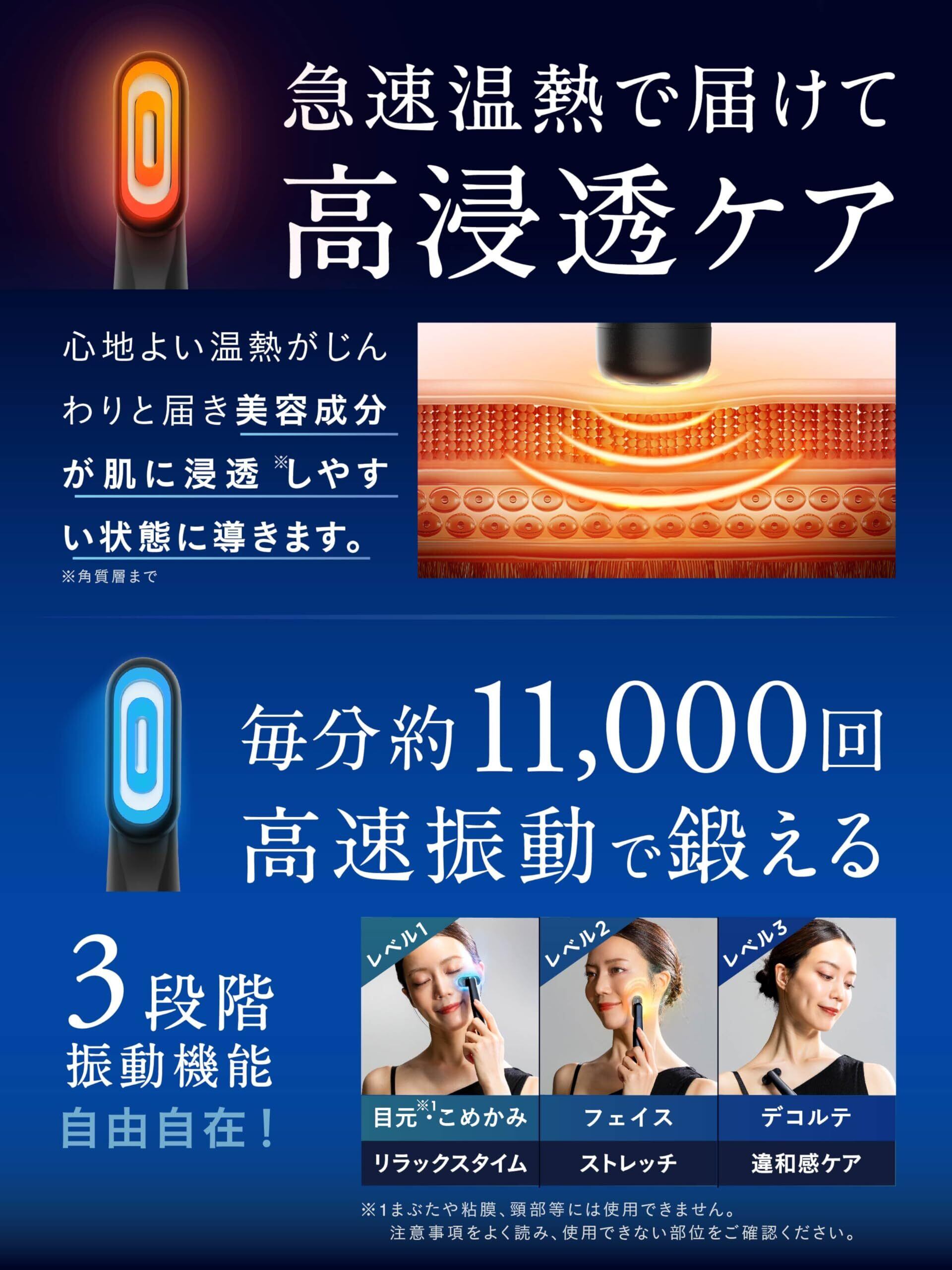 【温熱&高速振動で素肌美引き出す】内側から温めることで、明るくスッキリとした印象に。部位や肌悩みによって自由にレベル変更できる振動機能で、普段あまり動かすことがない筋肉のトレーニングが可能に!