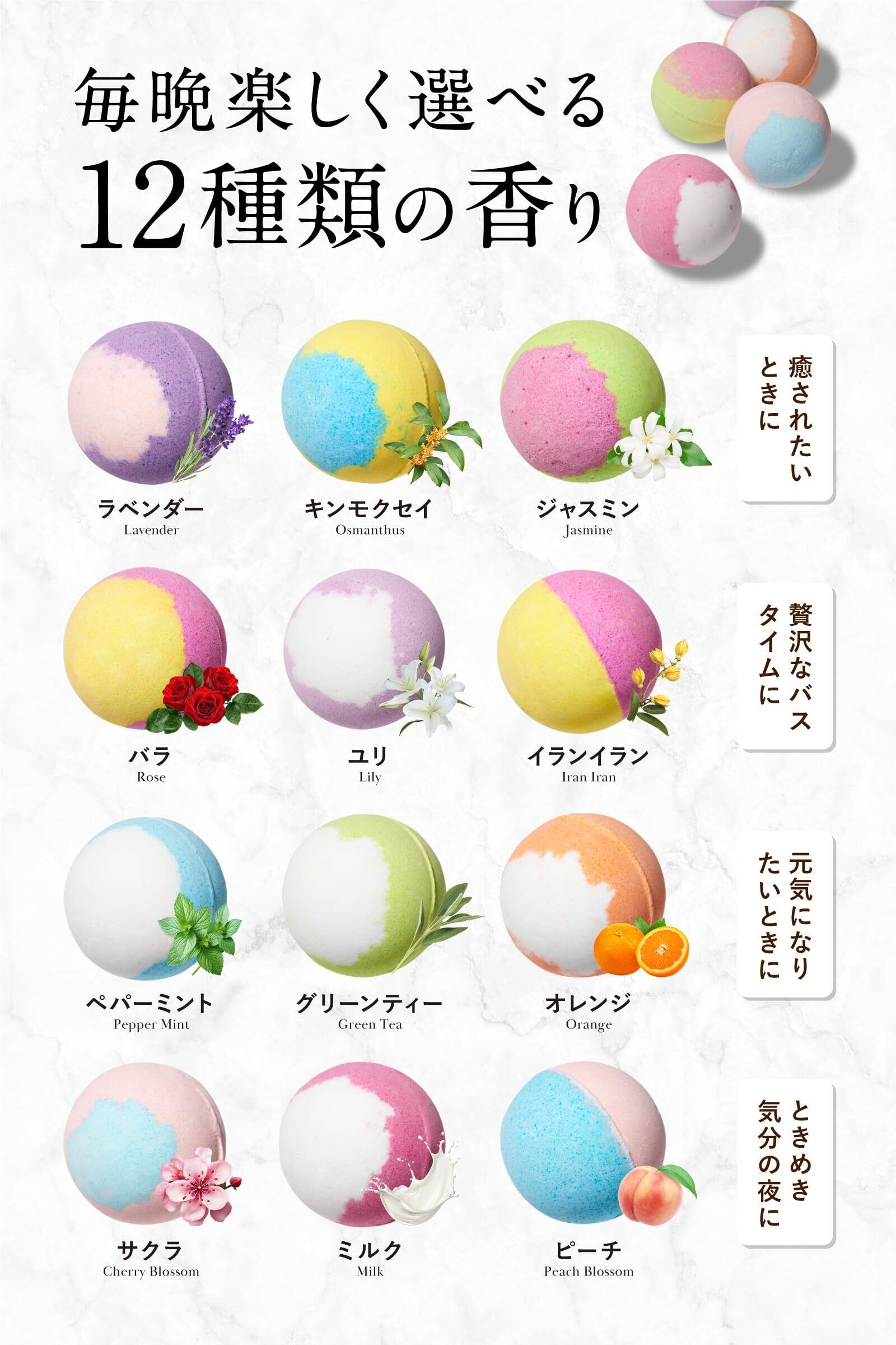 【12種類の香り】女性スタッフが厳選した、香りを楽しむバスボム。華やかな香りで、毎日楽しく選べる!