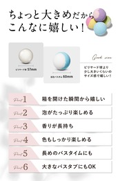 【ちょっと大きめ×見た目も楽しいカラフルさ】直径60mmと大きめなので、箱を開けた瞬間から嬉しい!カラフルで可愛いギフトセットです。バスボムのデザインがシンプルなので、どんな年齢の方にも贈りやすい。自分で使うときも泡、香り、色をしっかり楽しめる!長めのバスタイムにもぴったりです。