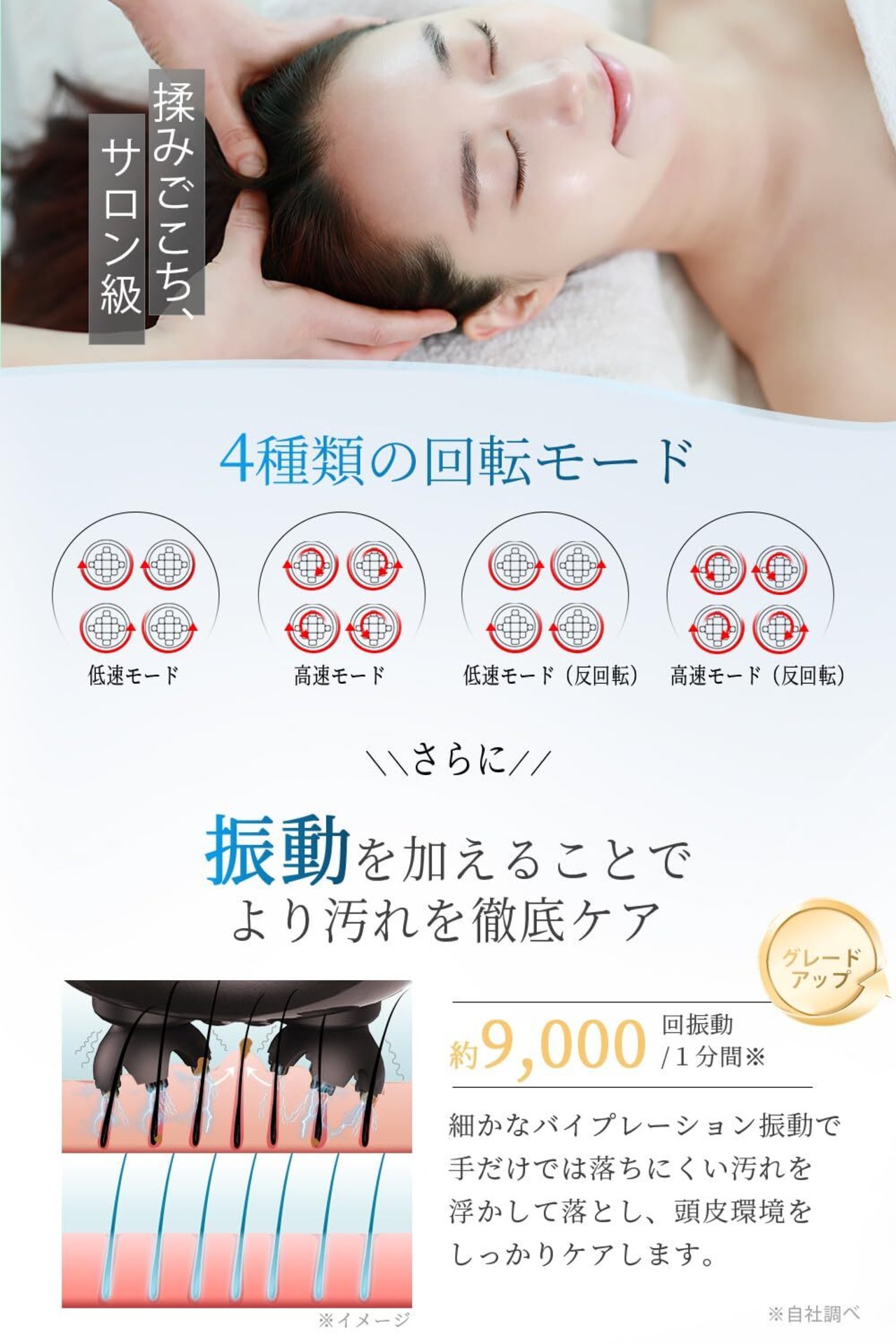 ️【プロの技術を再現したEMSヘッドスパ】4種類の回転モードと6種類の動きは、まるでプロの手技を体感しているかのような心地よい頭皮エステをご自宅でお楽しみいただけます。さらに、振動機能を加え、頭皮の毛穴汚れを浮かせ、心地よく叩いて落とします。1分間に約9000回の振動で、シャンプーしながらご使用いただくことで、手だけでは落ちにくい汚れもスッキリ洗浄され、柔らかな地肌へと導かれます。