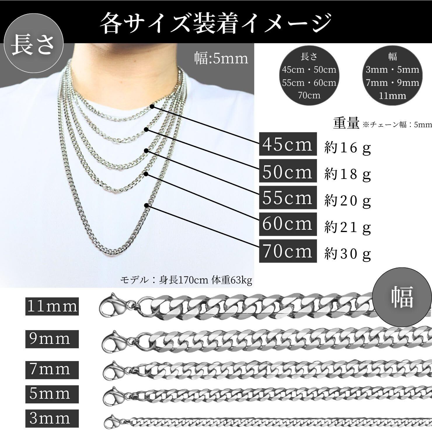 【豊富なバリエーション】カラーはシルバーとゴールド、チェーンの幅は3mm/5mm/7mm/9mm/11mm、長さは45cm/50cm/55cm/60cm/70cmの全50種類をご用意しております。スタイリッシュな印象の細めのデザインから存在感が抜群の太めのデザインまでお好みのデザインをお選びいただけます。※「商品の説明」より全サイズの画像がございますのでご参照くださいませ。また複数サイズを重ね付けしたり、お気に入りのペンダントトップを付けたり、様々な楽しみ方があるのでシンプルなのに飽きが来ない、そんなネックレスになります。