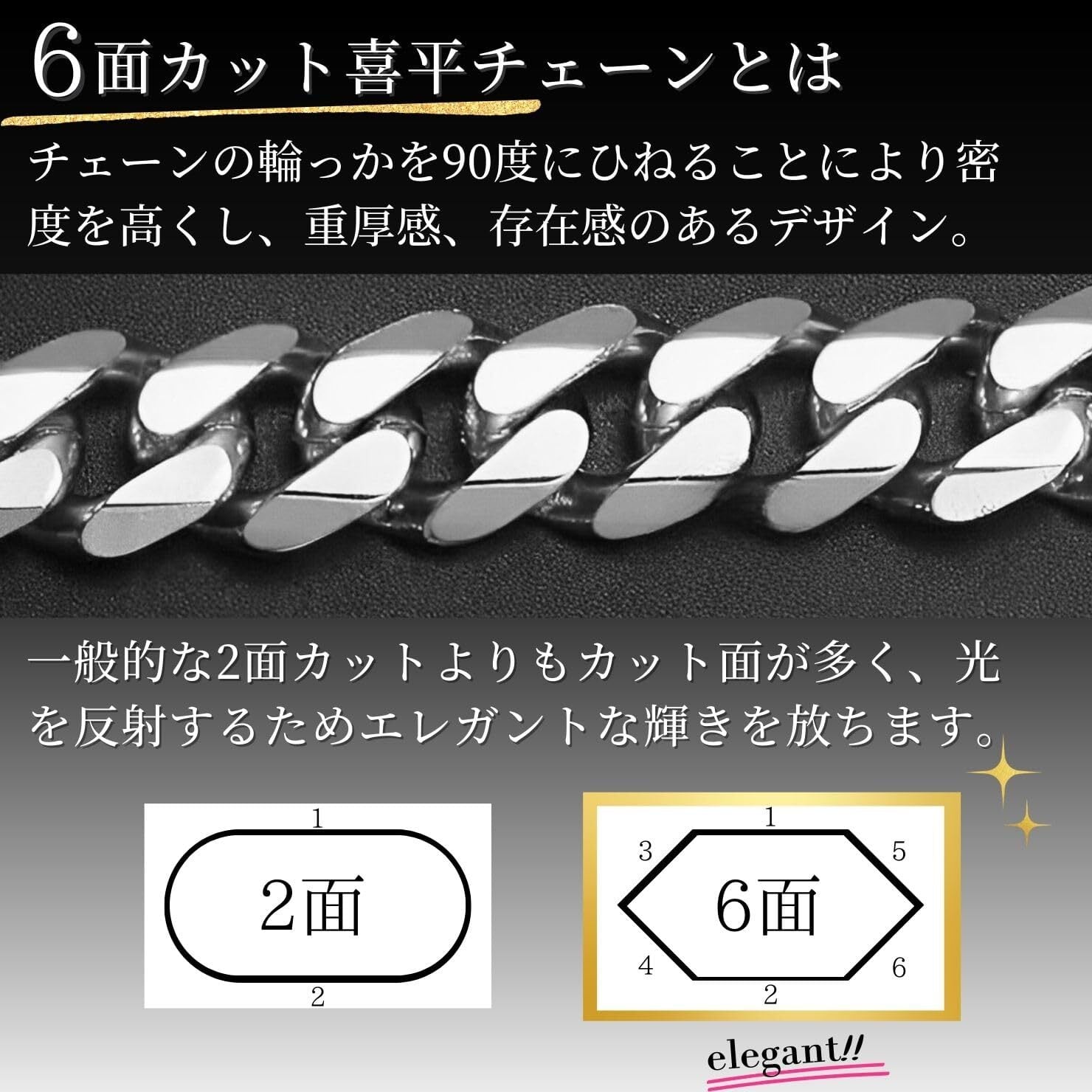 【6面カット喜平チェーンネックレス】チェーンの輪を90度ひねることにより全ての輪が正面を向き、密度を高くし千切れにくい耐久性のあるネックレスチェーンです。喜平チェーンの持つ重厚感と存在感は年齢層を問わず昔から愛される人気かつ定番のネックレスです。カットは匠の技が光る6面カットを採用。カット面が多いほど光を反射するので、一般的な2面カットやカットなしと比較すると華やかな輝きを放ちます。