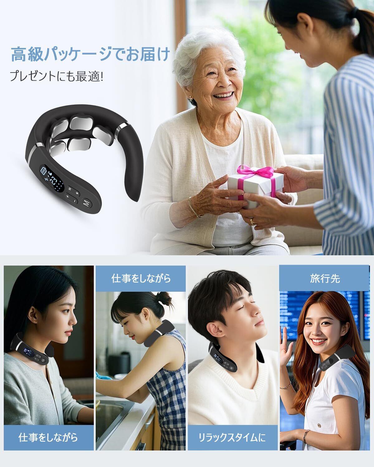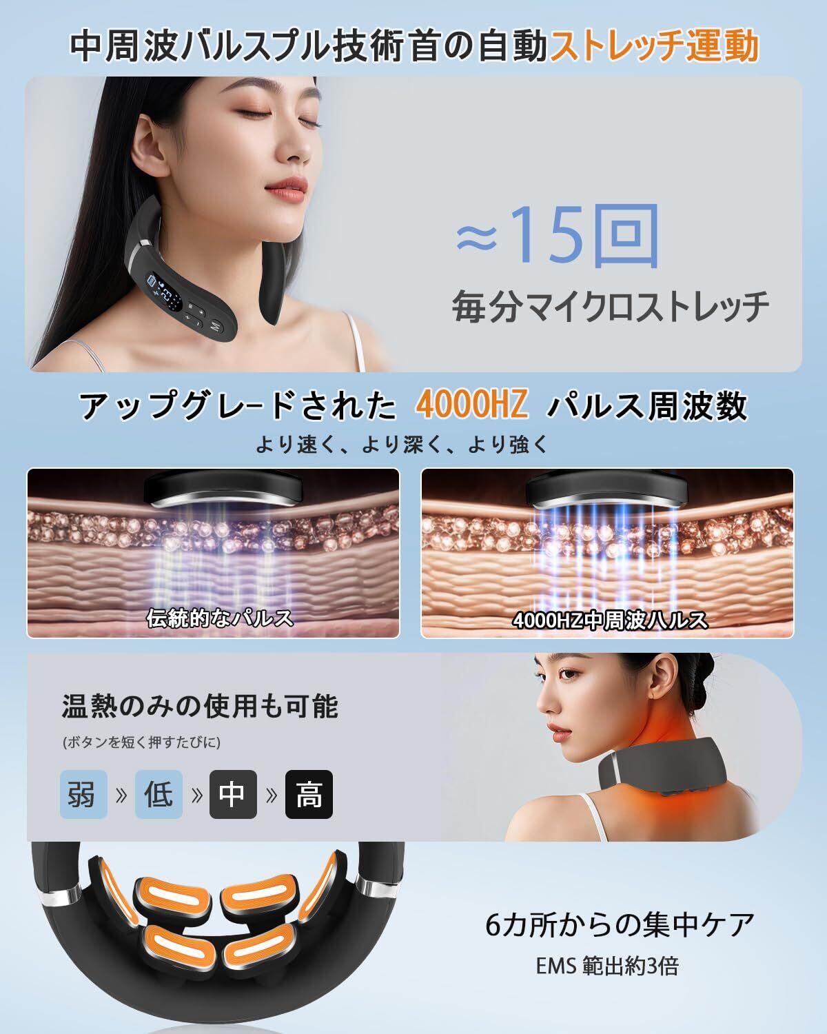 【温度調節・15分自動off】4つの温度モードが備わっており、環境に応じて調節できます。過熱防止装置を内蔵、15分連続稼働後自動的に止まり、過度使用を防ぎます。従来のリラクゼーション器とは異なり、手のひらサイズと超軽量設計を採用し、重力の呪縛から解放され、使用者の首への負担を最低限に!ご自宅はもちろん、外出時やオフィスいつでもどこでも、手軽にご使用いただけます。