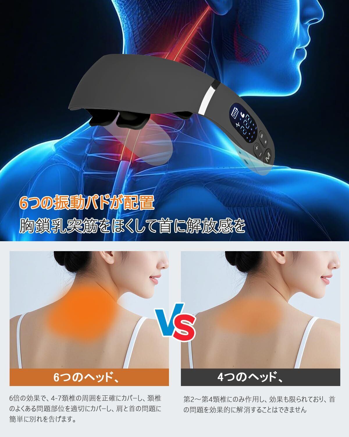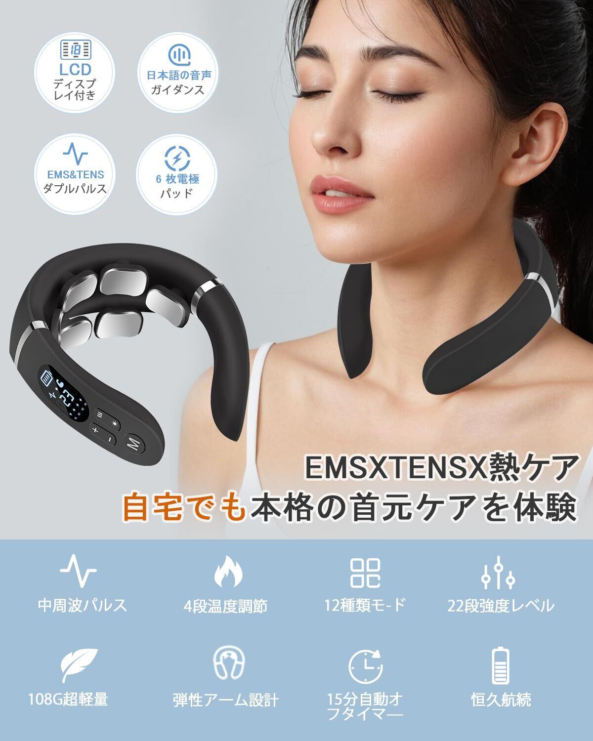 【数量限定】【2025新設計 ・6つパッド 】ネックケア 首 リラクゼーション器 温熱 EMS&TENSのW効果 首元 ネックリラックス 12種類モード 22段階強度 LED液晶ディスプレイ 日本語音声ガイダンス 静音 軽量 USB充電式 簡単操作 男女兼用 父の日 誕生日プレゼント お祝い 日本語説明書(ブラック)