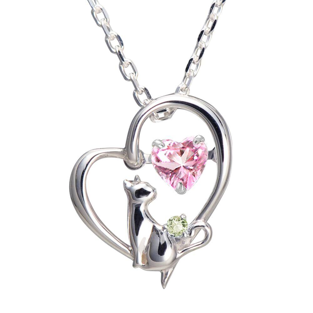 【在庫処分】[未来天使] ネックレス レディース ハート 猫 ダンシングストーン シルバー 選べる 誕生石 【ベビーピンクカラー】 8月 ペリドット