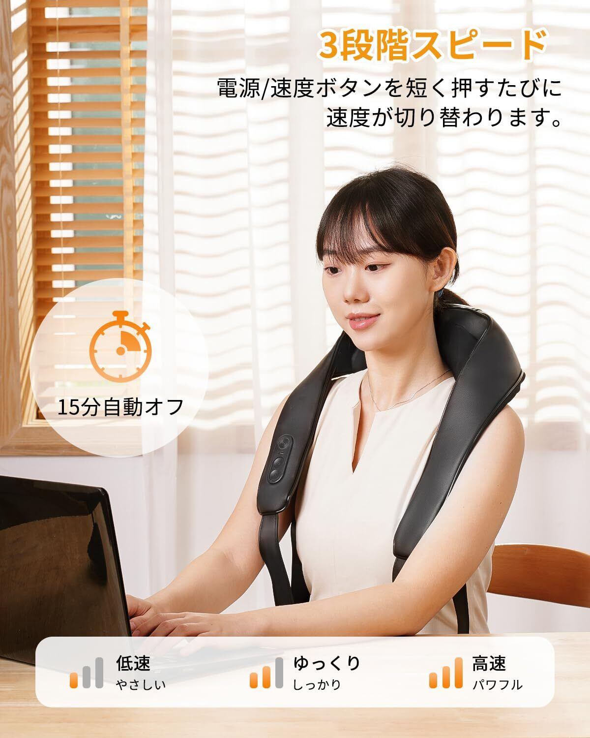 【2025年新登場首肩リラクゼーション器】従来品が首元を重点的にリラックスさせるのに対し、本製品は僧帽筋にアプローチ。デスクワークやスマホ使用で疲れた肩上部を的確にほぐし、深いリラックスをもたらします。1日たった15分、使用後にスッキリ感を得られます。そして、15分の自動オフタイマーが付いて、時間を気にせず使えます。