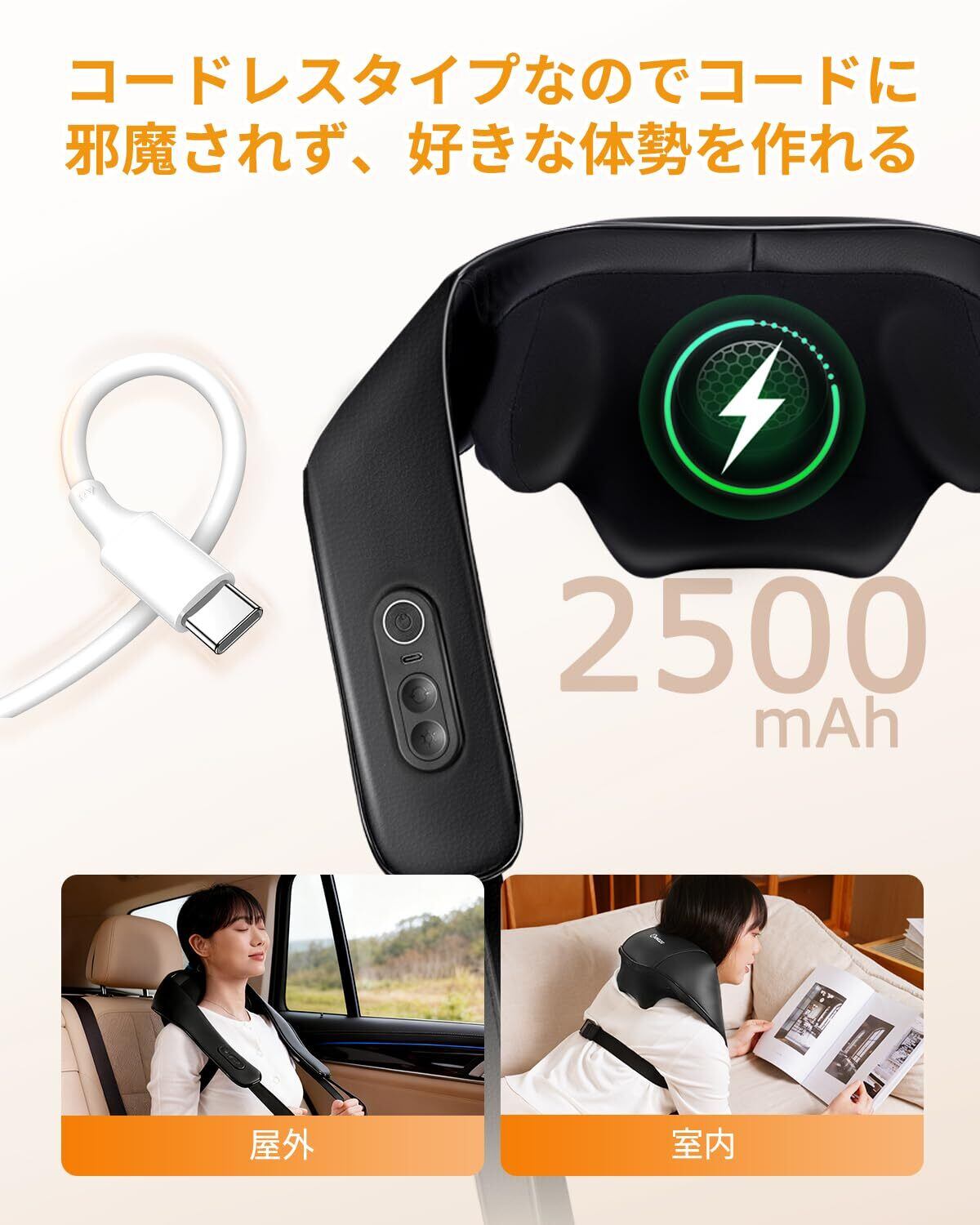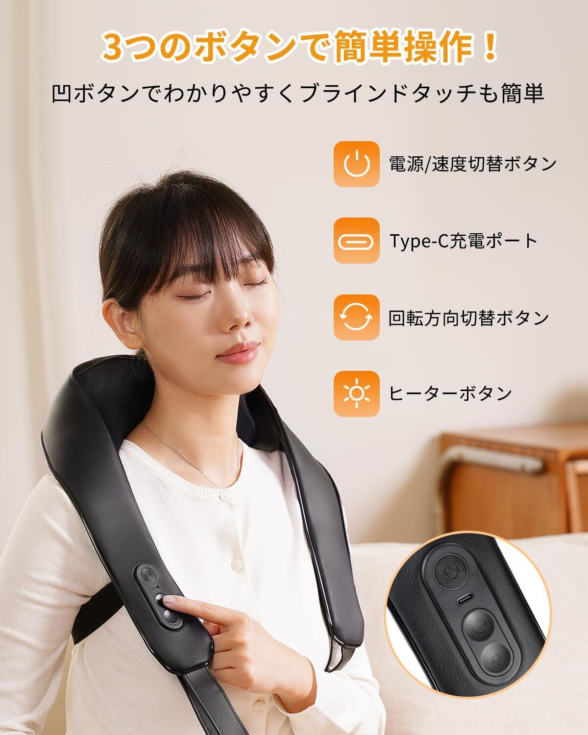 3段階スピード調整、2段階温度調節、回転方向調整、コンパクト、軽量、Type-C充電式コードレス仕様、ベルト付き、両手開放, 一台多役 首 肩 腰 太もも ネック ふくらはぎ 様々な部位に対応 コードレス式