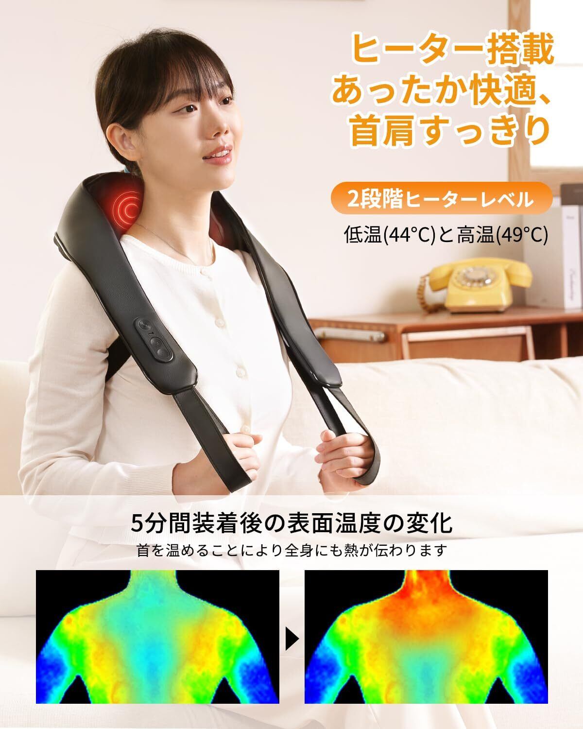 【2段階温熱レベル&操作簡単】首元回りを温めて心地よさアップ!44℃、49℃の2段階温度を選択可能です。温熱ボタンを押せばヒーター機能で首元回りをジンワリ温めてられる。また、操作面では、シンプルなボタン操作で誰でも簡単に使用できる設計となっています。