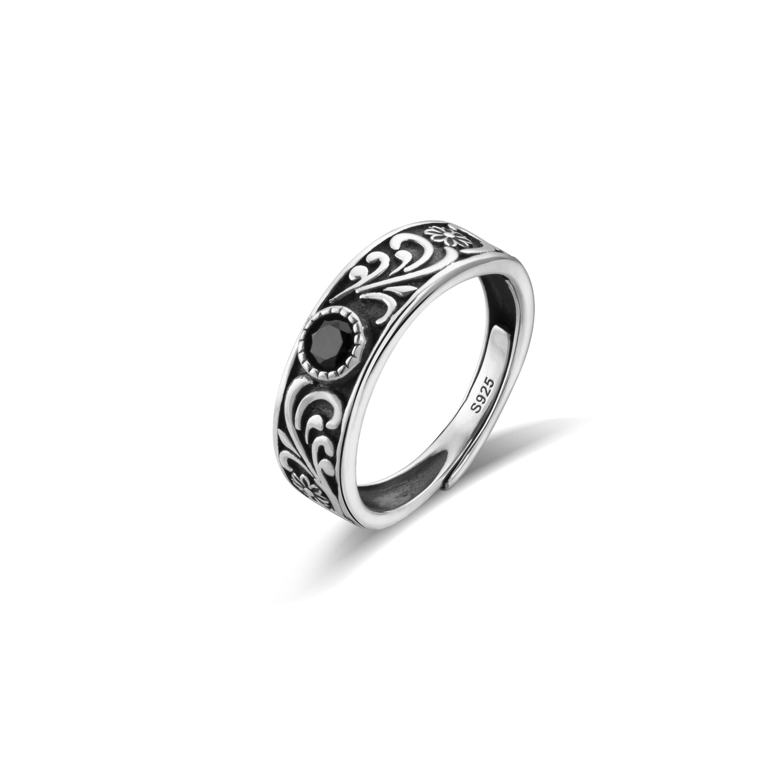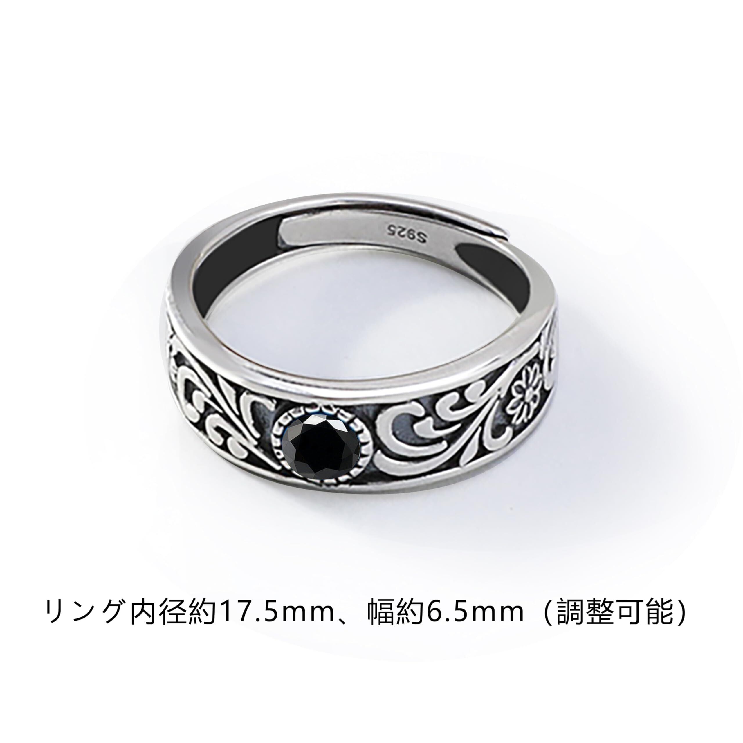 商品の詳細:フリーサイズ、調節可能。リング内径約17.5mm、厚さ約6.5mm。素材:肌に優しいシルバー925、人工ブラックスピネル石。付属品:精美な包装ケース