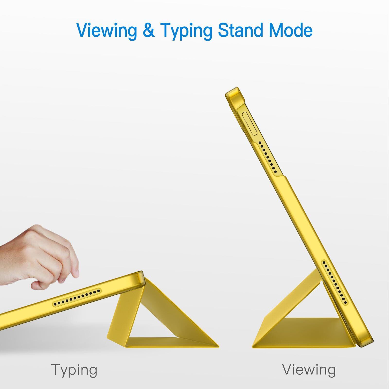 マグネット内蔵、オートスリープとオートウェイクアップ機能が付きます。三つ折りフロントカバーにより、視聴とタイピングに合わせた2つスタンド角度を調整できます