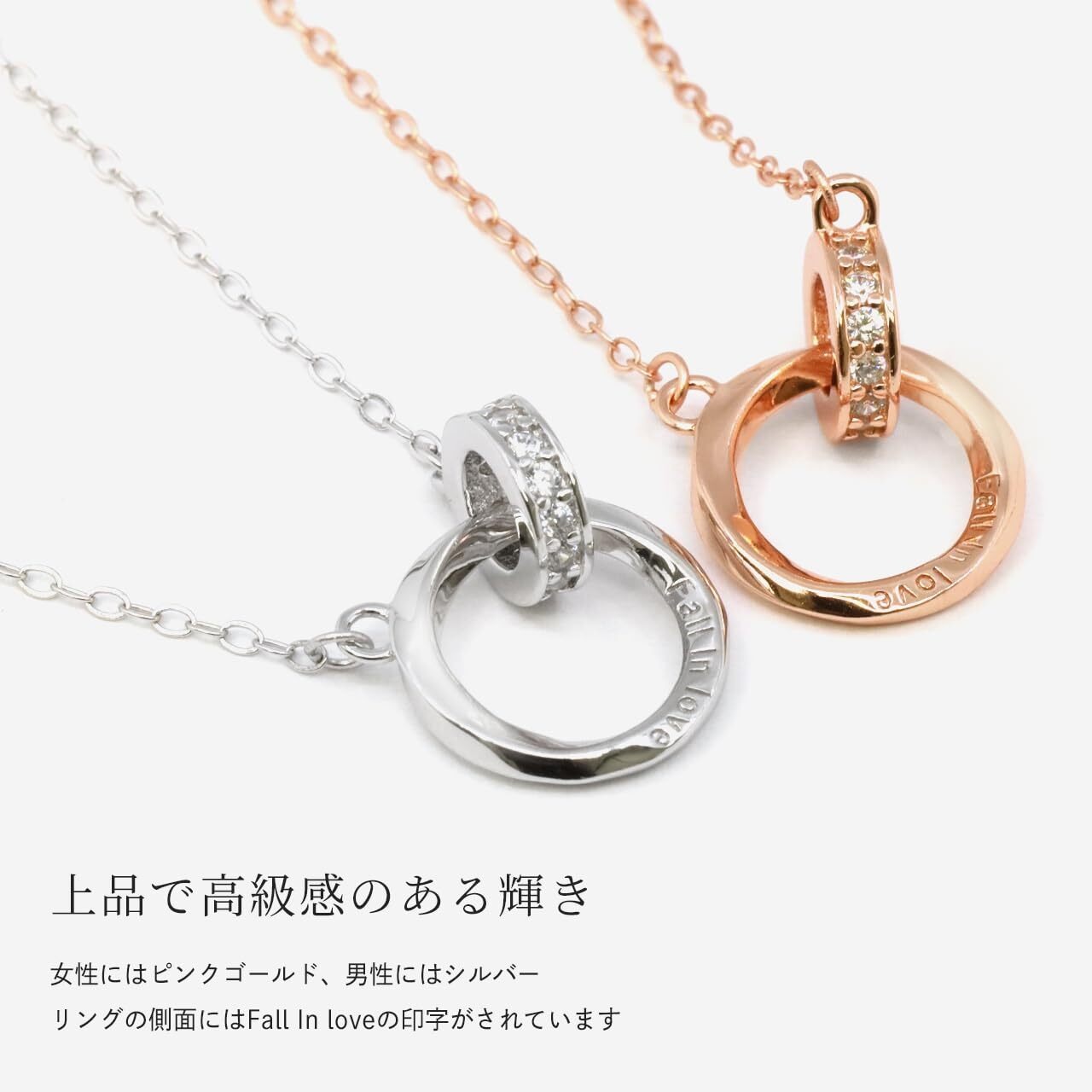 【ふたりの距離を近づける、特別なペアネックレス】リングトップには「Fall In love」のメッセージを刻印。女性には上品な輝きを放つピンクゴールドカラー、男性には洗練されたシルバーカラーで、さりげないお揃い感を演出します。カップルや夫婦など、大切なパートナーとの絆を深めたい方におすすめの大人向けブランドアクセサリーです。