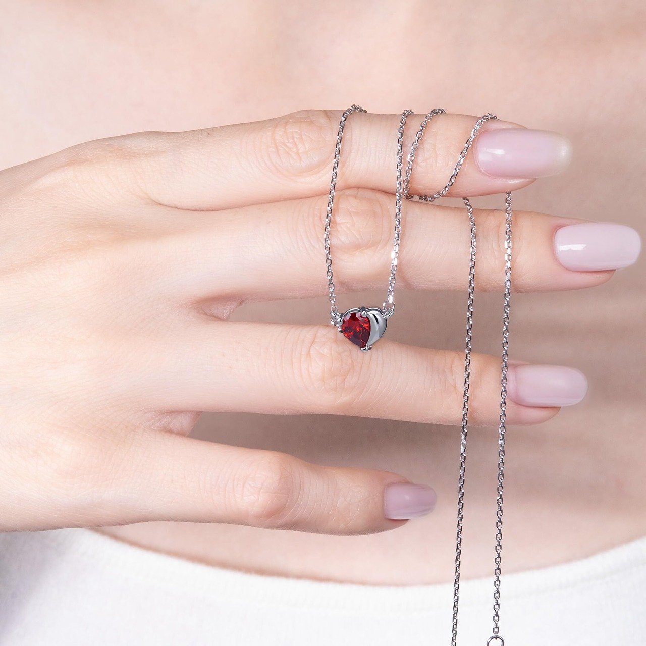 【仕樣】ネックレスチェーン長さ:40cm + 5cm(長さ調整可能)。ハート・ペンダントサイズ:縦7.2mm 横8.4mm。ハート型の誕生石ネックレスは、ジルコニアとプラチナメッキのチェーンで組み合わさったデザインです。内部は高純度銅素材を採用し、金属による過敏症を起こしにくく、敏感なお肌の方にもお使いいただけます。