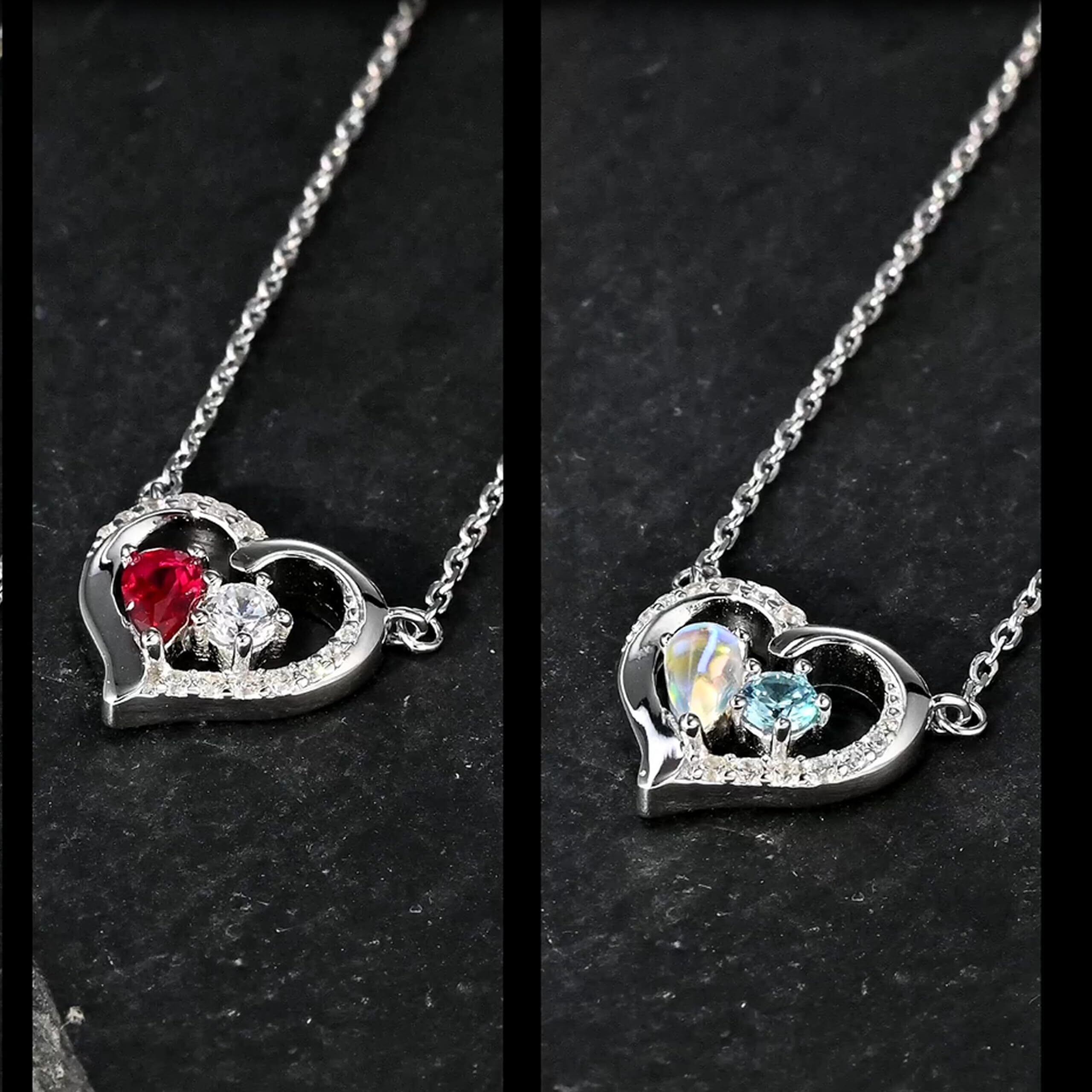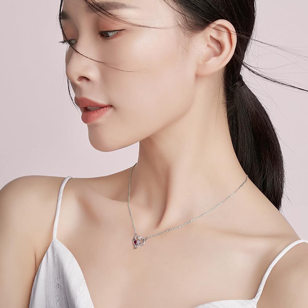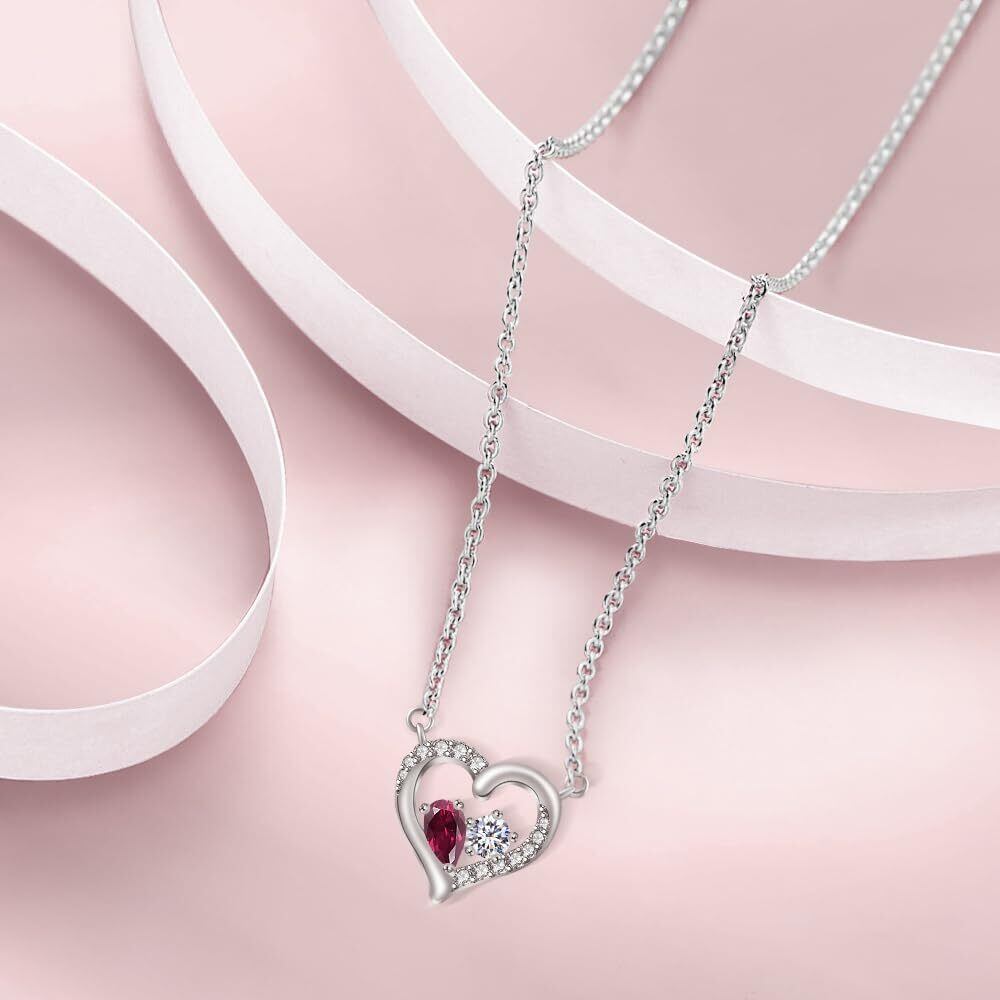 ルビーの情熱:7月の誕生石ルビーは、深みのある赤が情熱と生命力を象徴します。白いジルコンとのコントラストが、ハート型デザインをよりドラマティックに演出。ルビーの深みのある赤は、シックな大人コーデのアクセントに